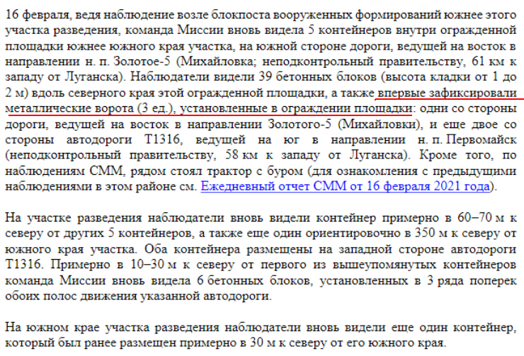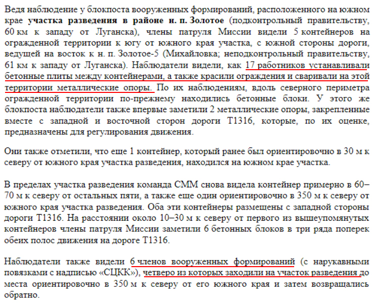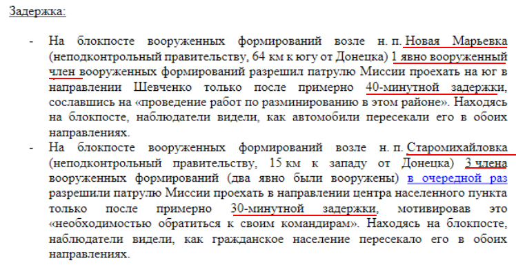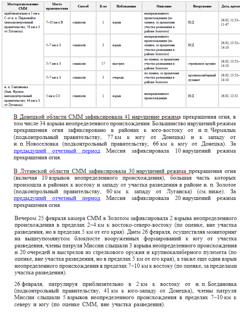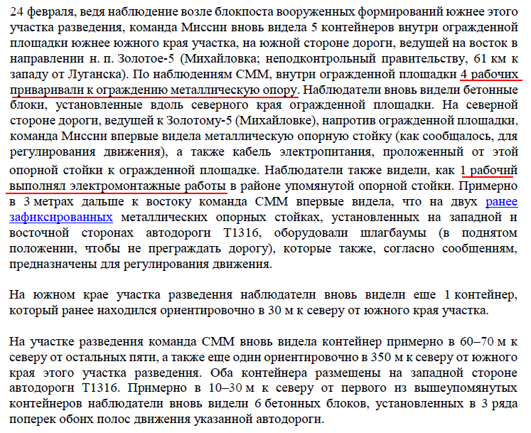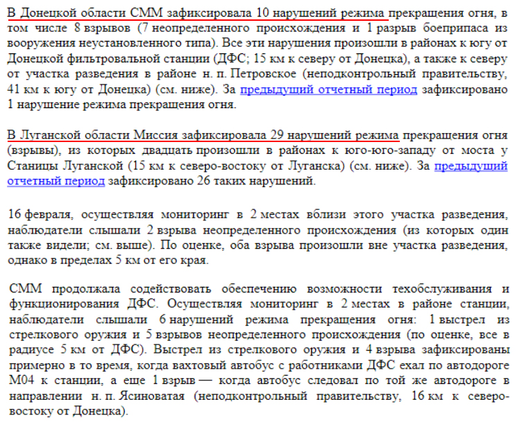 Українська сторона СЦКК Українська сторона Спільного центру з контролю та координації питань припинення вогню та стабілізації лінії розмежування сторін інформує про систематичне перешкоджання діяльності СММ ОБСЄ на окупованих територіях. Тільки протягом 13 лютого збройні формування РФ та її найманці тричі відмовляли представникам Місії у доступі до запланованих місць проведення моніторингу. На блокпостах окупаційних військ поблизу населених пунктів Староласпи, Шевченко та Лукове Донецької області патрулям СММ ОБСЄ забороняли доступ до районів спостереження та фіксації порушень, посилаючись на «проведення інженерних робіт» та «відсутність наказів командирів». Подібні дії та відмови у доступі Місії на непідконтрольну уряду України територію мають надумані причини та приводи, метою яких є приховування порушень Мінських домовленостей, а також небажання дотримуватися норм міжнародного права.