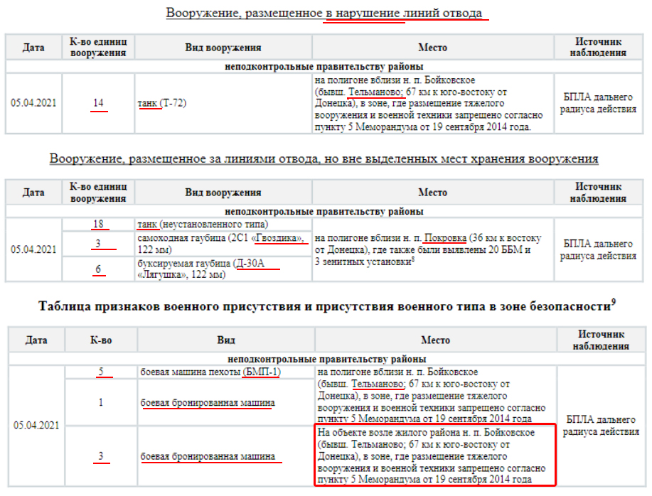 Українська сторона СЦКК Українська сторона СЦКК повідомляє про грубі порушення з боку збройних формувань РФ та її найманців, про що йдеться у звіті СММ ОБСЄ № 75/2021 від 1 квітня. 31 березня патруль СММ ОБСЄ зафіксував 15 реактивних систем залпового вогню БМ-21 «Град», калібру 122 мм., що були розміщені з порушенням ліній відведення поблизу населеного пункту Хрустальний на тимчасово окупованих територіях Луганщини. За межами виділених місць зберігання, 29 березня, зафіксовано 9 танків, 6 самохідних гаубиць та 29 бойових броньованих машин на полігоні поблизу населеного пункту Міусинськ. А на полігоні поблизу Мирного, - 3 танки Т-64, що теж на тимчасово окупованих територіях Луганської області, Збройні формування РФ та їхні найманці продовжують перешкоджати роботі патрулів СММ ОБСЄ. На в’їзді до колишнього аеропорту поблизу Переможного, неподалік Луганська, представник збройних формувань РФ відмовив у проїзді патрулю СММ посилаючись на проведення тренування до параду на честь перемоги, запланованого на 9 травня. 31 березня, на блокпості окупантів поблизу населеного пункту Олександрівка, члени збройних формувань РФ вимагали від патруля ОБСЄ надати для догляду автомобілі та причіпи, однак отримали відмову, адже такі дії заборонені Мандатом СММ ОБСЄ. Лише через годину через блокпост дозволили проїхати одному автомобілю без причепу. Збройні формування РФ продовжують застосовувати стрілецьку зброю з метою перешкоджання роботі БПЛА патрулів ОБСЄ. 31 березня, патруль СММ, під час здійснення запланованого польоту БПЛА малого радіусу дії в районі населеного пункту Бугаївка, що на тимчасово окупованій території Луганської області, зафіксував 25 черг із крупнокаліберного кулемету у напрямку БПЛА. Команда Місії негайно приземлила літальний апарат та залишила цей район. Перешкоджання роботі СММ ОБСЄ з боку російських найманців набуло систематичного характеру, метою яких є затримки та не допуски патрулів до місць або об'єктів, на яких готуються та проводяться різноманітні порушення, заборонені Мінськими домовленостями. Патрулі СММ ОБСЄ за допомогою БПЛА продовжують фіксувати раніше облаштовані та нові мінні загородження на ТОТ. 26 березня приблизно за 1,2 км на північ від населеного пункту Гольмівський на ТОТ Донецької області, БПЛА СММ середнього радіусу дії вкотре зафіксував 10 та ще 6 протитанкових мін біля Доломітного, що належать збройним формуванням РФ. Такі дії збройних формувань РФ продовжують дестабілізувати обстановку вздовж усієї лінії розмежування. З приводу цього порушення, Українською стороною СЦКК направлено ноту на СММ ОБСЄ. Вкотре наголошуємо, що підрозділи Збройних Сил України знаходяться на позиціях і неухильно дотримуються зобов’язань, щодо всеосяжного режиму припинення вогню, які були досягнуті в рамках Тристоронньої контактної групи.