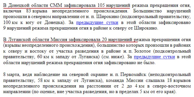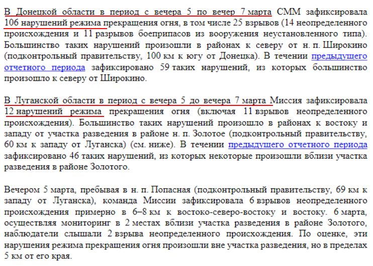 З 2 по 5 квітня на Донбасі зафіксовано 1550 порушень режиму “тиша” – звіт ОБСЄ З 2 по 5 квітня Моніторингова місія ОБСЄ зафіксувала 1550 випадків порушення режиму припинення вогню на Донбасі. Про це йдеться у звіті Спеціальної моніторингової місії ОБСЄ в Україні. 1424 порушення було зафіксовано у Донецькій області та 126 – у Луганській. Окрім того, на Донеччині за цей період було зафіксовано 281 вибух. 900 цих порушень режиму припинення вогню сталися у ніч з 2 на 3 квітня в районі на південь від окупованої Горлівки. У Луганській області з вечора 2 квітня по вечір 5 квітня Місія зафіксувала 126 порушень режиму припинення вогню, усі – вибухи невизначеного походження. Більшість цих вибухів (79) було зафіксовано ввечері 2 квітня у районах на північ від окупованої Кадіївки та на південному сході підконтрольної уряду Попасної.
