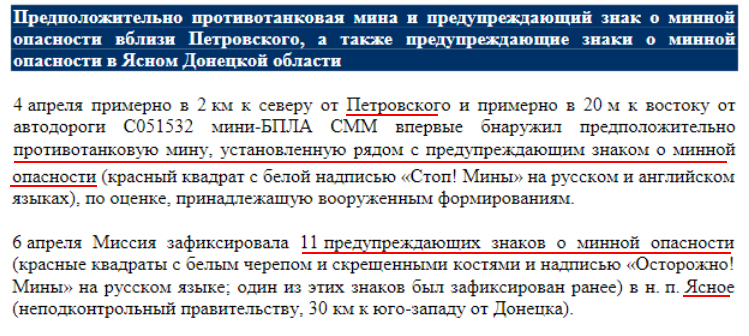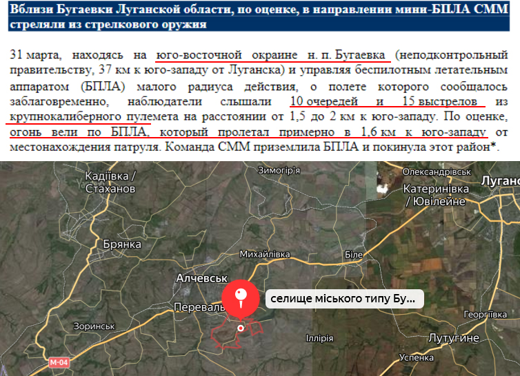 За повідомленням СММ ОБСЄ від 15 березня, команда Місії втратила контроль над просторовим положенням БПЛА середнього радіусу дії. Про це йдеться у повідомленні на сторінці Операції об’єднаних сил у соціальній мережі Facebook. Під час виконання запланованого польоту, вранці 14 березня, патруль Місії перебував неподалік населеного пункту Степанівка, що за 54 км на північ від Донецька. Близько 12.00, пролітаючи над районами поблизу населеного пункту Петрівка, приблизно за 12 км від місцеположення команди СММ, апарат зазнав впливу перешкод сигналу, після чого о 12:09 спостерігачі СММ втратили контроль над його просторовим місцеположенням. Упродовж 20 хвилин члени патруля Місії безуспішно намагалися відновити зв’язок із літальним апаратом. Того ж дня, завдяки допомозі місцевого населення підконтрольної Урядові України території, спостерігачам вдалося повернути БПЛА, який зазнав незначного пошкодження. Українська сторона СЦКК повідомляє, що 16 березня об 11.14 мав місце ще один інцидент із перешкоджання роботі літальних апаратів СММ ОБСЄ. Зокрема, здійснюючи запланований обліт поблизу населеного пункту Авдіївка, Донецької області, представники Місії вимушені були здійснити екстрену посадку БПЛА після того, як він зазнав перешкод РЕБ. Уважно вивчивши і співставивши зазначені випадки перешкоджання роботі літальних апаратів СММ, та користуючись власними джерелами інформації, УС СЦКК дійшла висновку, що джерела радіоелектронного впливу, глушіння БПЛА знаходилися на тимчасово окупованій території та належали збройним формуванням РФ. Маючи значний радіус впливу, такі засоби РЕБ, як Р-330М1П «Діабазол» та Р-330Ж «Житєль» , що стоять на озброєнні збройних сил Російської Федерації, протягом лютого-березня поточного року систематично створюють радіоперешкоди БПЛА Місії з передмість тимчасово окупованих Горлівки та Єнакієва. Зазначені комплекси неодноразово фіксувалися БПЛА СММ на тимчасово окупованій території. Підтвердженням застосування окупантами засобів РЕБ типу Р-330Ж є факт, який мав місце 7 березня. Тоді БПЛА дальнього радіусу дії «S-100» Місії, працюючи в цьому ж районі, зазнав глушіння сигналу обох модулів GPS та зазнав аварії приблизно за 1,5 км на схід від населеного пункту Романівка. Метою зазначених дій окупантів є дискредитація підрозділів Збройних Сил України та перешкоджання діяльності СММ ОБСЄ. Будь-які сфабриковані російсько-окупаційними військами ОРДЛО повідомлення стосовно зазначених інцидентів, надумані і містять елементи антиукраїнської пропаганди. Збройні Сили України неухильно дотримуються досягнутих домовленостей щодо припинення вогню та є послідовними у виконанні взятих на себе зобов’язань і всіляко сприяють СММ ОБСЄ у виконанні нею Мандату.