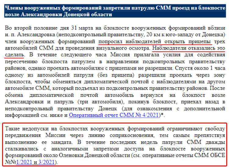 Бойовики на Донбасі блокують роботу ОБСЄ Російські найманці на Донбасі не пускають спостерігачів місії ОБСЄ на непідконтрольну українському уряду територію, посилаючись на те, що там проходять військові навчання. Про це йдеться у звіті СММ ОБСЄ за 2 квітня. У відомстві зауважили, що в Донецькій області на блок-пості збройних формувань біля Новоазовська два озброєних бойовики не пропустили патруль СММ на південний захід, пояснивши це проведенням навчань в цьому районі. Водночас спостерігачі бачили, як цивільні автомобілі перетинали блок-пост в обох напрямках. Крім того, на блок-пості збройних формувань біля Нової Мар’ївки озброєні бойовики не пропустили патруль СММ в проїзді на південь, пояснивши це проведенням навчань. Але і в цьому районі спостерігачі бачили, як цивільні автомобілі перетинали блок-пост в обох напрямках. Також на блокпості бойовиків біля Безіменного четверо озброєних бойовиків не пропустили патруль на захід, мотивуючи це проведенням навчань. Натомість на блок-пості біля Староласпа окупанти відмовили патрулю СММ ОБСЄ в проїзді на окуповану територію. Вони пояснили це проведенням інженерних робіт в цьому районі й розмінування, попри це цивільні автомобілі перетинали блок-пост в обох напрямках.