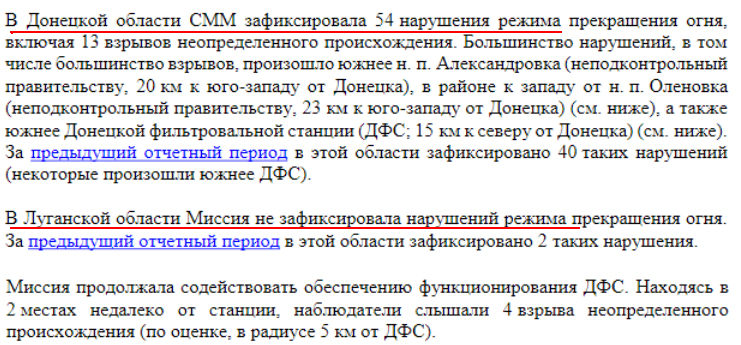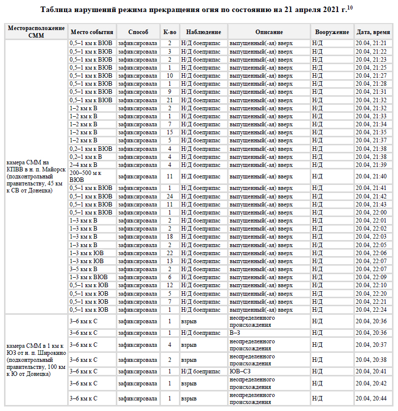 Українська сторона СЦКК повідомляє про випадки грубих порушень Мінських домовленостей та міжнародного гуманітарного права з боку збройних формувань РФ. Останнім підтвердженням цього є випадок одночасного застосування БПЛА збройних формувань Російської Федерації та дистанційного мінування протипіхотними мінами ПОМ-2, що стався 13 квітня 2021 року у безпосередній близькості до об'єкту цивільної інфраструктури – КПВВ «Майорськ». Близько 05.00 БПЛА противника скинув три гранатометних постріли ВОГ-25 калібру 40 мм на позицію ЗС України поблизу населеного пункту Майорськ з одночасним дистанційним мінуванням цивільної інфраструктури КПВВ «Майорськ» за допомогою п'яти протипіхотних мін ПОМ-2, наражаючи на небезпеку чергову зміну Державної прикордонної служби України та місцеве населення. Випадок застосування БПЛА російськими найманцями є грубим порушенням Мінських домовленостей, а факт дистанційного мінування мінами ПОМ-2, які є тільки на озброєнні армії РФ – є доказом прямої причетності Російської Федерації до збройного конфлікту на території Донецької та Луганської областей.