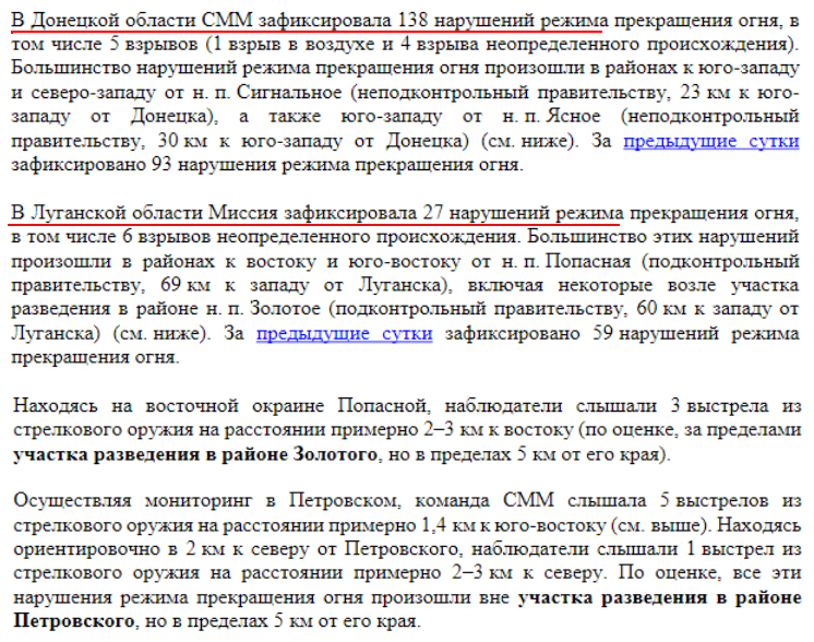 ОБСЄ зафіксувала на Донбасі 165 порушень припинення вогню Спостерігачі Організації з безпеки і співробітництва в Європі зафіксували 165 порушень припинення вогню на Донбасі. Найбільше порушень було в Донецькій області. Про це йдеться у звіті ОБСЄ за 20 квітня. Зокрема, повідомляється, СММ ОБСЄ зафіксували 138 порушень режиму припинення вогню в Донецькій області і 27 – на Луганщині. “У Донецькій області СММ зафіксувала 138 порушень режиму припинення вогню, у тому числі 5 вибухів (1 вибух у повітрі та 4 вибухи невизначеного походження)”, – йдеться у звіті. Більшість цих порушень в Донецькій області зафіксували в районах на північному заході і північному заході від Сигнального, непідконтрольного уряду. Також напруженою була ситуація в районі Ясного. У Луганській області зафіксували 27 порушень режиму припинення вогню, у тому числі 6 вибухів невизначеного походження. Більшість цих порушень сталися в районах на сході і південному сході від Попасної і Золотого, які розміщені на лінії зіткнення.
