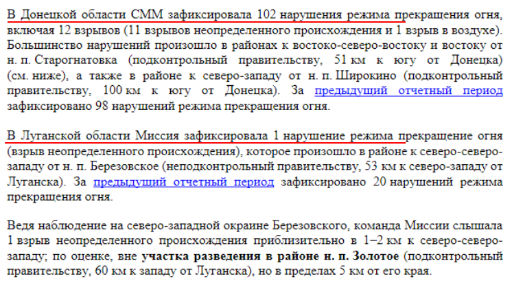 Боевики «ДНР» не пропускают через блокпосты наблюдателей СММ ОБСЕ. Боевики «ДНР» и российские оккупанты не пропускают наблюдателей СММ ОСБЕ через блокпосты в районе временно оккупированных н.п. Старомихайловка, Новая Марьевка и Старопетровское. «На блокпосте возле н. п. Старомихайловка (не подконтрольный правительству, 15 км к западу от Донецка) член вооруженных формирований снова не пропустил патруль Миссии к западу в населенный пункт, сославшись на отсутствие предварительного согласования такого посещения. Находясь на блокпосте, наблюдатели видели, что гражданские автомобили свободно проезжали через блокпост. На блокпосте около н. п. Новая Марьевка (не подконтрольный правительству, 64 км к югу от Донецка) 3 вооруженных члена вооруженных формирований не пропустили патруль СММ к югу в направлении н. п. Шевченко (не подконтрольный правительству, 69 км к югу от Донецка), мотивируя это «проведением в этом районе работ по разминированию». Находясь на блокпосте, наблюдатели слышали 1 взрыв неопределенного происхождения и видели черный дым приблизительно в 3 км к западу от своей позиции. На блокпосте у н. п. Старопетровское (не подконтрольный правительству, 35 км к северо-востоку от Донецка) 2 вооруженных члена вооруженных формирований отказали патрулю Миссии в проезде к западу в направлении н. п. Корсунь (не подконтрольный правительству, 31 км к северо-востоку от Донецка) по «соображениям безопасности СММ». Находясь на блокпосте, наблюдатели отметили, что гражданским транспортным средствам также отказывали в проезде на запад, а также слышали 33 выстрела из стрелкового оружия, которые, по оценке, были частью учений с боевой стрельбой в зоне безопасности».