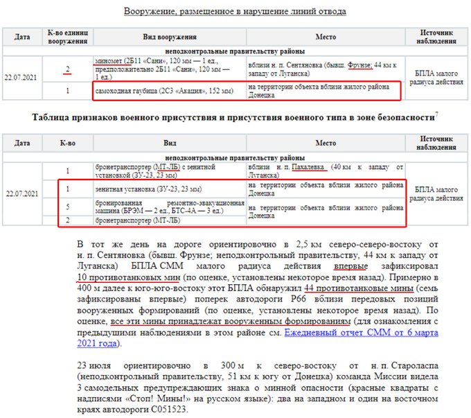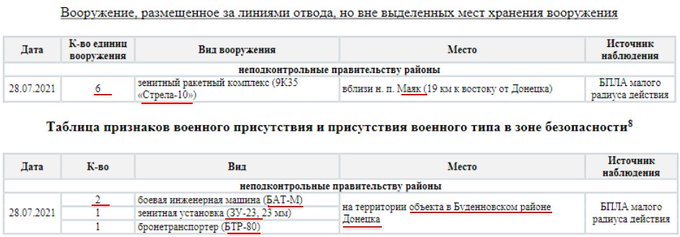 Українська сторона СЦКК Українська сторона СЦКК повідомляє про грубі порушення з боку збройних формувань РФ та її найманців, про що йдеться у Звіті СММ ОБСЄ від 31 липня 2021 року. Так, БПЛА малого радіуса дії СММ ОБСЄ зафіксував озброєння, розміщене за межами виділених місць зберігання на полігонах Успенка та Круглик на тимчасово непідконтрольній Уряду України території Луганської області, а саме: 6 протитанкових гармат, 20 гаубиць та 61 танк. Також кремлівські найманці розмістили в зоні безпеки на території об’єкту в Будьонівському районі Донецька 4 одиниці БТР, 8 одиниць МТ-ЛБ, землерийну машину (МДК-3) та броньовану ремонтно-евакуаційну машину (БТС-4А). Крім того, збройні формування Російської Федерації продовжують перешкоджати роботі Місії на тимчасово окупованій території, створюючи перепони та обмеження, а інколи навіть відкрито погрожуючи. Зокрема, в Оперативному звіті СММ ОБСЄ №19/2021 поширено інформацію про погрозу окупантів збити БПЛА СММ поблизу Старомихайлівки у разі його запуску. Вчергове окупанти заборонили перебуванню команді Місії на пункті пропуску поблизу населеного пункту Ізварине та затримали представників СММ ОБСЄ на блокпостах поблизу окупованих населених пунктів Оленівка та Старомихайлівка. Систематичні відмови СММ у доступі до районів на тимчасово окупованих територіях з боку кремлівських найманців вкотре засвідчують факт приховування численних порушень Мінських домовленостей задля подальшого загострення обстановки в районі проведення операції Об’єднаних сил.