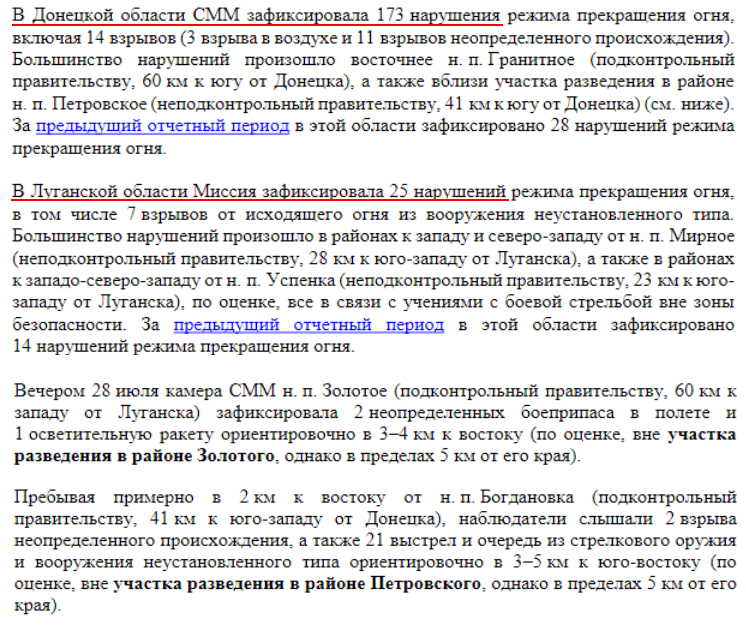 Українська сторона СЦКК Українська сторона Спільного центру з контролю та координації питань припинення вогню та стабілізації лінії розмежування сторін інформує про грубі порушення з боку збройних формувань РФ, які зафіксовані та оприлюднені у щоденному звіті СММ ОБСЄ від 24 липня 2021 року. У звіті повідомляється про факти перешкоджання запланованим польотам безпілотних літальних апаратів СММ ОБСЄ. БПЛА Місії зазнавали впливу перешкод сигналу GPS (за оцінкою, унаслідок імовірного глушіння) під час польотів над районами біля тимчасово окупованих населених пунктів Петрівське, Саханка та Первомайськ. Вкотре, з метою дискредитації Збройних Сил України перед міжнародною спільнотою, використовуючи комплекси РЕБ російського виробництва, окупанти створювали перешкоди БПЛА Місії під час запуску літальних апаратів та польотів над підконтрольними Уряду України територіями в районах населених пунктів Семигір’я та Широкине. Для придушення сигналів БПЛА над підконтрольною Уряду України територією російсько-окупаційні війська застосовують комплекси РЕБ, які розміщені в районах населених пунктів Алчевськ, Горлівка, Донецьк, Луганськ, Вербова Балка, Михайлівка та Новоазовськ. Також вперше зафіксовано вплив комплексу РЕБ на сигнал БПЛА з нової позиції поблизу тимчасово окупованого населеного пункту Маркине Донецької області. Українська сторона СЦКК вважає неприпустимими подібні дії російсько-окупаційних військ, які призводять до ескалації напруги як на лінії розмежування так і в цілому в районі проведення операції Об’єднаних сил.