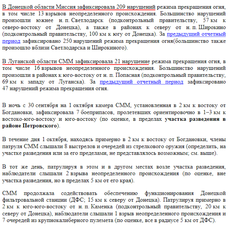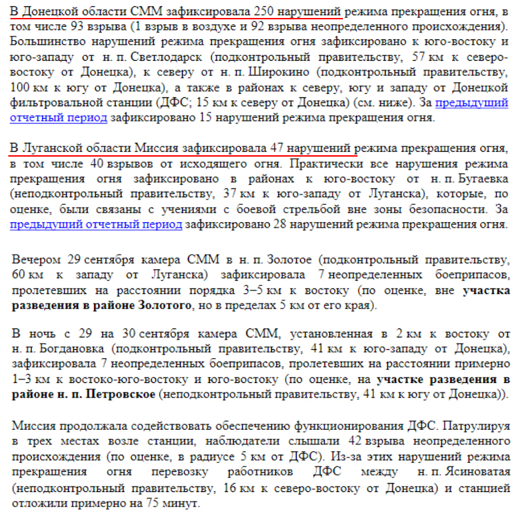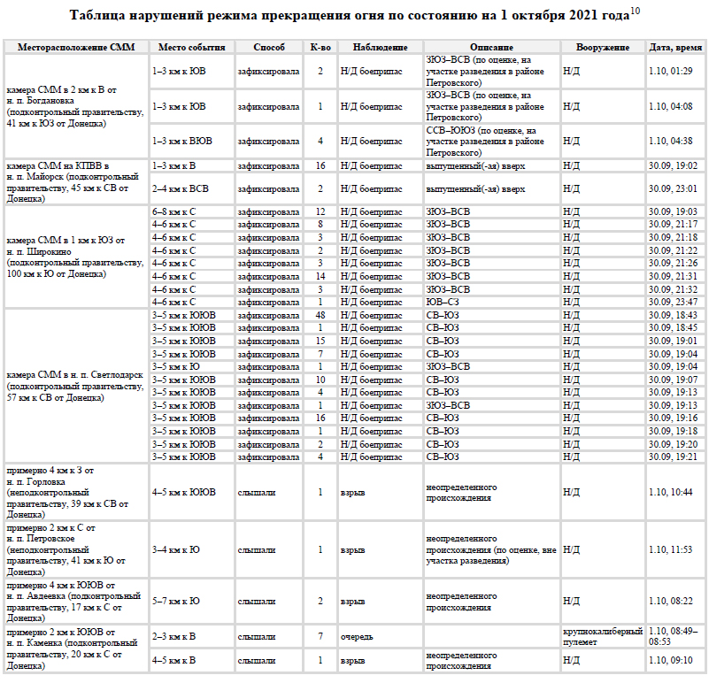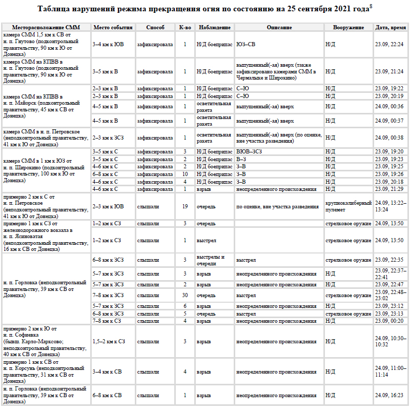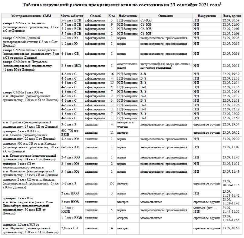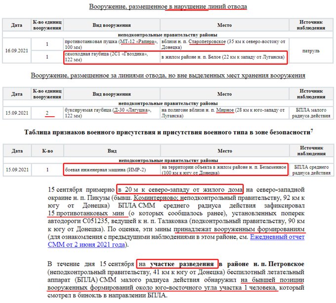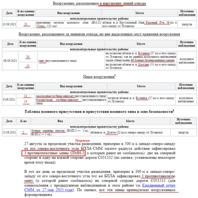 Українська сторона СЦКК Українська сторона СЦКК повідомляє про факти порушень з боку збройних формувань РФ на непідконтрольній Україні території Луганської та Донецької областей, які зафіксовані Спільною моніторинговою місією ОБСЄ, та оприлюднені у Щоденному звіті № 217/2021 від 16 вересня 2021 року. Патрулями СММ ОБСЄ зафіксовано розміщення на тимчасово окупованій території 210 одиниць озброєння та військової техніки, яка розміщена з порушенням лінії відведення, у зоні якої згідно з пунктом 5 Меморандуму від 19 вересня 2014 року розміщення важкого озброєння та військової техніки заборонено. Так, на полігоні, який розташований поблизу населеного пункту Тернове (57 км східніше Донецька), за даними повітряного спостереження, виявлено 44 бойових броньованих машин та 7 самохідних гаубиць 2С1 “Гвоздика”. Неподалік населеного пункту Покровка (36 км східніше Донецька), за даними повітряного спостереження, виявлено 13 бойових броньованих машин та 3 реактивні системи залпового вогню БМ-21 “Град”. На полігоні поблизу населеного пункту Міусинськ (62 км південніше Луганська), за даними повітряного спостереження, виявлено 49 бойових броньованих машин, 13 танків (не встановленого типу), 11 буксированих та 8 самохідних гаубиць (не встановленого типу), 1 зенітний ракетний комплекс (не встановленого типу). Неподалік населеного пункту Тернове (57 км східніше Донецька) виявлено 9 танків Т-72, 2 зенітно-ракетних комплекси 9К35 “Стріла-10”. Поблизу населеного пункту Покровка (36 км східніше Донецька) виявлено 31 танк Т-72, 7 буксированих гаубиць Д-30А “Жаба” калібру 122-міліметри, 2 протитанкові гармати МТ-12 “Рапіра”, та 3 буксированих міномети 2Б9 “Волошка”. Неподалік населеного пункту Міусинськ (62 км на південний захід від Луганська) виявлено 6 реактивних систем залпового вогню (не встановленого типу). Також поблизу населеного пункту Лобачеве (13 км східніше Луганська) виявлено1 бойову броньовану машину, ймовірно БМП. Вкотре наголошуємо, що підрозділи Збройних сил України знаходяться на позиціях і неухильно дотримуються зобов’язань, щодо всеосяжного режиму припинення вогню, які були досягнуті в рамках зустрічі Тристоронньої контактної групи.