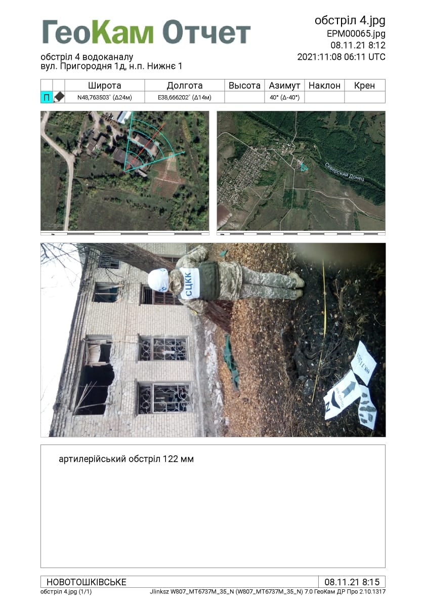 Українська сторона СЦКК Українська сторона СЦКК продовжує інформувати громадськість про факти порушень режиму припинення вогню з боку збройних формувань РФ Так, 7 листопада у період з 15.00 до 15.30 збройні формування РФ обстріляли населений пункт НИЖНЄ 1 (СВІТЛИЧНЕ) із застосуванням артилерії калібру 122 мм. У результаті обстрілу зазнали значних пошкоджень будівлі та техніка водоканалу, зруйновано приміщення та знищене устаткування хіміко-бактеріологічної лабораторії. Зафіксовано 6 влучань снарядів калібру 122 мм. З метою запобігання ескалації напруженості на лінії зіткнення, українська сторона СЦКК закликає СММ ОБСЄ якнайшвидше відреагувати на порушення режиму припинення вогню, оцінити такі порушення та провести моніторингові заходи в цьому районі.