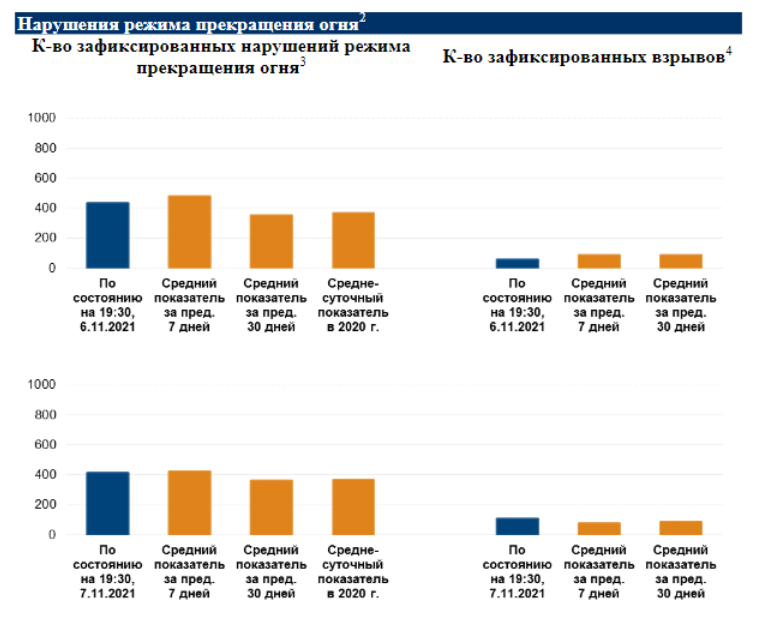 Українська сторона СЦКК Українська сторона СЦКК повідомляє про чергові факти порушень з боку збройних формувань РФ на окупованих територіях Луганської та Донецької областей, які зафіксовані СММ ОБСЄ та оприлюдненні у щоденному звіті від 5 листопада 2021 року Так, спостерігачі Місії зафіксували 285 одиниць бронетанкового та артилерійського озброєння збройних формувань РФ, розміщених поза межами визначених районів відведення. Зокрема, у зоні дій так званого “2 армійського корпусу” збройних формувань РФ було виявлено 284 одиниці бойової техніки, у тому числі: в районі Бугаївки: танки – 25 одиниць, артилерійські системи – 12 одиниць, ББМ – 74 одиниці; в районі Круглик: танки – 27 одиниць, в районі Мирне: самохідні артилерійські установки – 9 одиниць, причіпна артилерія – 22 одиниці, ББМ – 84 одиниці. Також у межах житлової забудови Докучаївська, у зоні дій так званого “1 армійського корпусу” збройних формувань РФ, було виявлено зенітну установку ЗУ-23-2. Водночас, представники збройних формувань РФ продовжували перешкоджати роботі патрулів Місії на окупованих територіях. Так, на блок-посту біля Старомихайлівки члени збройних формувань РФ зупинили патруль СММ, не дозволивши спостерігачам проїхати до населеного пункту. Так само був затриманий патруль СММ на блок-посту збройних формувань РФ поблизу ділянки розведення № 3 в районі Петрівське. Протягом останніх двох діб безпілотні літальні апарати Місії під час виконання спостережних польотів систематично піддавались впливу засобів радіоелектронної боротьби збройних формувань РФ в районі окупованих Новокиївка, Озарянівка, Огульчанськ та Гольмівський. Внаслідок цих перешкод, СММ ОБСЄ не вдалося виявити та встановити дійсну кількість озброєння та бойової техніки збройних формувань РФ, які перебувають поза межами визначених районів та ліній відведення. Тому дані, наведені у звіті не відображують справжніх масштабів злочинної діяльності збройних формувань РФ на захоплених ними територіях. Підрозділи Об’єднаних сил, як і раніше, перебувають на визначених рубежах та у встановлених районах.