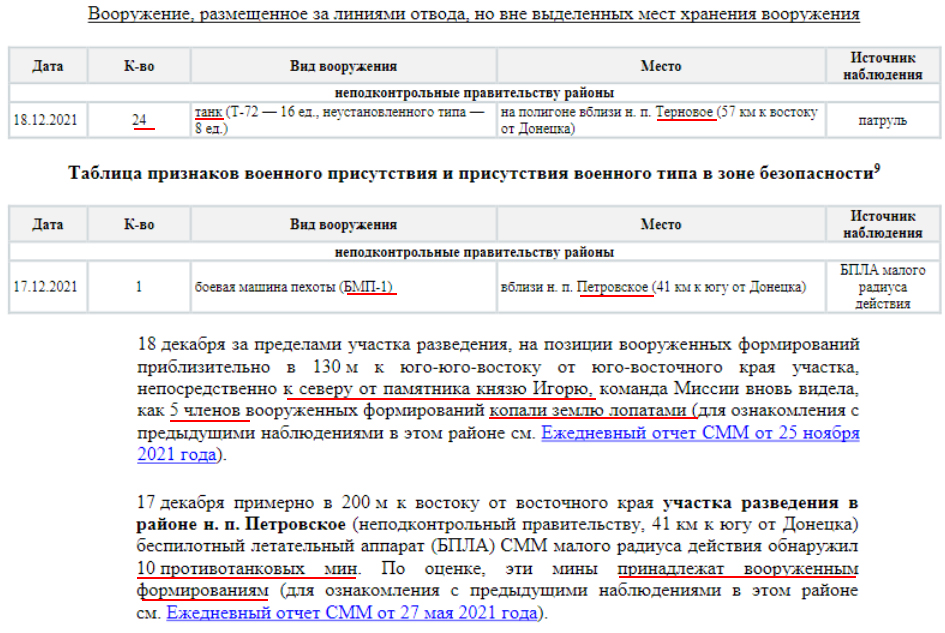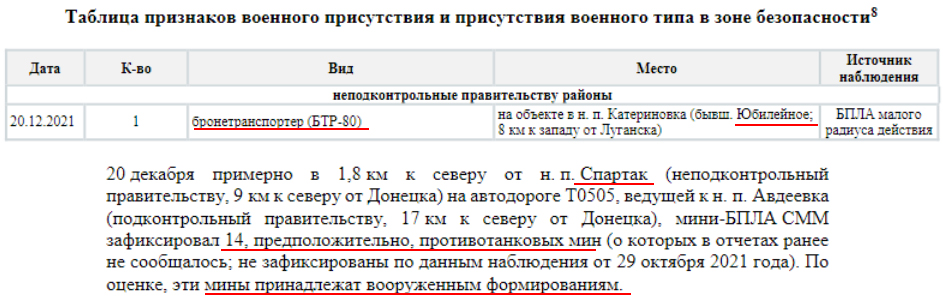 Українська сторона СЦКК Українська сторона СЦКК повідомляє про чергові факти порушень Мінських домовленостей з боку збройних формувань Російської Федерації на тимчасово окупованих територіях Луганської та Донецької областей. Спостерігачі СММ ОБСЄ зафіксовали розміщення на тимчасово окупованій території 109 одиниць військової техніки збройних формувань РФ, яка розміщена з порушенням Мінських домовленостей. В районі дій так званого 2 армійського корпусу ЗФ РФ зафіксовано 8 РСЗВ БМ-21 «Град», розміщених з порушенням ліній відведення, а саме: в районі Міусинськ – 6 одиниць; в районі Садовий – 2 одиниці. Також в районі дій 2 армійського корпусу ЗФ РФ в районі Міусинськ поза межами визначених місць зберігання зафіксовано: танки Т-72 та Т-64 – 19 одиниць; САУ 2С1 «Гвоздика», 122 мм – 6 одиниць; причіпні гармати 2А36 «Гіацинт-Б», 152 мм – 4 одиниці; причіпні гаубиці 2А65 «Мста-Б», 152 мм – 10 одиниць; причіпні гаубиці Д-30, 122 мм – 16 одиниць; міномети 2Б11 «Сани», 120 мм – 9 одиниць. ЗРК 9К35 «Стріла-10» – 5 одиниць; ББМ – 31 одиниця. В районі дій так званого 1 армійського корпусу ЗФ РФ з порушенням ліній відведення, в межах житлової забудови населеного пункту Старомихайлівка було виявлено 120 мм міномет 2Б11 «Сани». Там же було виявлено зенітну установку ЗУ-23-2. Робота СММ ОБСЄ на тимчасово окупованих територіях супроводжувалась численними перешкоджаннями з боку збройних формувань Російської Федерації. Всього, з 19.11.2021, СММ ОБСЄ опубліковано 9 оперативних звітів, в яких повідомляється про перешкоджання роботі Місії з боку збройних формувань РФ. Так, у щоденному та оперативному звітах СММ ОБСЄ, опублікованих 3 грудня 2021 року повідомляється про заборону доступу патрулям Місії на блокпостах збройних формувань РФ поблизу Старомихайлівка, Хрещатицьке, Шевченко, Нова Мар’ївка, Золоте та Молодіжне. Зафіксовані порушення з боку ЗФ РФ свідчать про ведення ними активних заходів бойової підготовки задля створення передумов для подальшої ескалації напруження на лінії зіткнення. Підрозділи Об’єднаних сил тримають ситуацію під контролем та продовжують виконувати завдання з відсічі і стримування збройної агресії РФ. Збройні Сили України дотримуються Мінських домовленостей та відкривають вогонь виключно у тих випадках, коли дії російських окупаційних військ створюють загрозу для життя і здоров’я українських воїнів та мирних громадян.