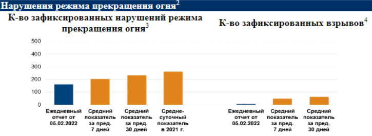 Українська сторона СЦКК Українська сторона СЦКК повідомляє про чергові факти порушень Мінських домовленостей з боку збройних формувань Російської Федерації на тимчасово окупованих територіях Луганської та Донецької областей. На відміну від 03.02.2022, коли було виявлено 205 одиниць озброєння та військової техніки та від 05.02.2022, коли було виявлено 178 одиниць озброєння та військової техніки, протягом минулої доби виявлено та зафіксовано розміщення на тимчасово окупованій території 104 одиниці військової техніки, яка розміщена з порушенням Мінських домовленостей. Зокрема в зоні дій так званого «1 армійського корпусу», в районі ТЕРНОВЕ (57 км від лінії зіткнення) розміщено озброєння та військова техніка з порушенням лінії відведення – самохідні гаубиці (3 одиниці). В зоні дій так званого «2 армійського корпусу», всього розміщено 101 одиниця озброєння та військової техніки, з них: з порушенням лінії відведення в районах: ПЕРЕМОЖНЕ (19 км від лінії зіткнення) – буксирувана протитанкова гармата (1 одиниця); буксирувані гаубиці (3 одиниці); ІРМІНО (54 км від лінії зіткнення) – буксирувані гаубиці (4 одиниці); БІЛЕ (22 км від лінії зіткнення) – самохідні гаубиці (2 одиниці); буксирувані гаубиці (4 одиниці); з порушенням районів зберігання в районах: ШИМШИНІВКА (27 км від лінії зіткнення) – танки (8 одиниць); МИРНЕ (28 км від лінії зіткнення) – танки (5 одиниць); буксирувані гаубиці (9 одиниць); самохідні гаубиці (8 одиниць); протитанкові гармати (4 одиниці); КРУГЛИК (31 км від лінії зіткнення) – танки (10 одиниць); самохідні гаубиці (7 одиниць); ПЕРЕМОЖНЕ (19 км від лінії зіткнення) – танки (2 одиниці); міномет (1 одиниця); буксируваний міномет (1 одиниця); військова присутність в зоні безпеки в районах: ШИМШИНІВКА (27 км від лінії зіткнення) – БТР (18 одиниць); МИРНЕ (28 км від лінії зіткнення) – БМП (14 одиниць). Разом з тим, 05.02.2022 СММ ОБСЄ зафіксувала 21-ну довгострокову вогневу точку (бліндаж), розміщені біля дороги неподалік НОВОСВІТЛІВКА, що в 16 км на південний схід від тимчасово окупованого ЛУГАНСЬКА. Робота СММ ОБСЄ на тимчасово окупованих територіях супроводжувалась перешкодами з боку збройних формувань Російської Федерації. Так, на блокпості поблизу ГОРЛІВКА озброєний представник збройних формувань дозволив патрулю Місії перетнути лінію зіткнення в напрямку непідконтрольних урядові районів лише після затримки. Також, БПЛА СММ малого радіуса дії зазнавали впливу засобів РЕБ, що перешкоджало сигналу GPS під час польотів над ділянками в районах СМІЛЕ, НОВОГРИГОРІВКА та НОВИЙ. Зафіксовані порушення з боку ЗФ РФ свідчать про систематичне створення ними передумов для подальшої ескалації напруження. Підрозділи Об’єднаних сил тримають ситуацію під контролем та продовжують виконувати завдання з відсічі і стримування збройної агресії РФ. Збройні Сили України залишають за собою право відкривати вогонь у відповідь у випадку наступальних дій після невдалої спроби використання координаційного механізму по реагуванню на порушення режиму припинення вогню.