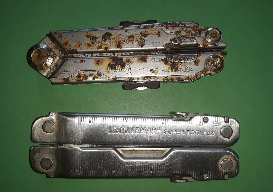 "Мне было интересно, какой мультитул положить в сумку для лодки, поэтому я оставил свои Gerber и Leatherman на балконе на несколько месяцев, чтобы посмотреть, как они справятся с погодой. Я живу в 2 км от Тихого океана. Ни один из них не был в соленой воде"