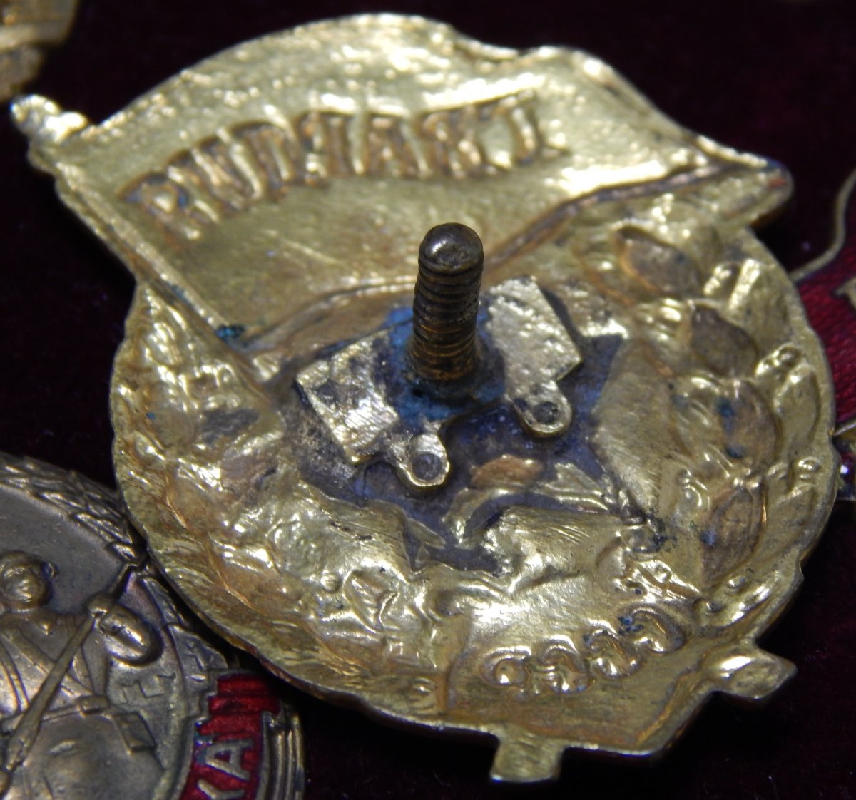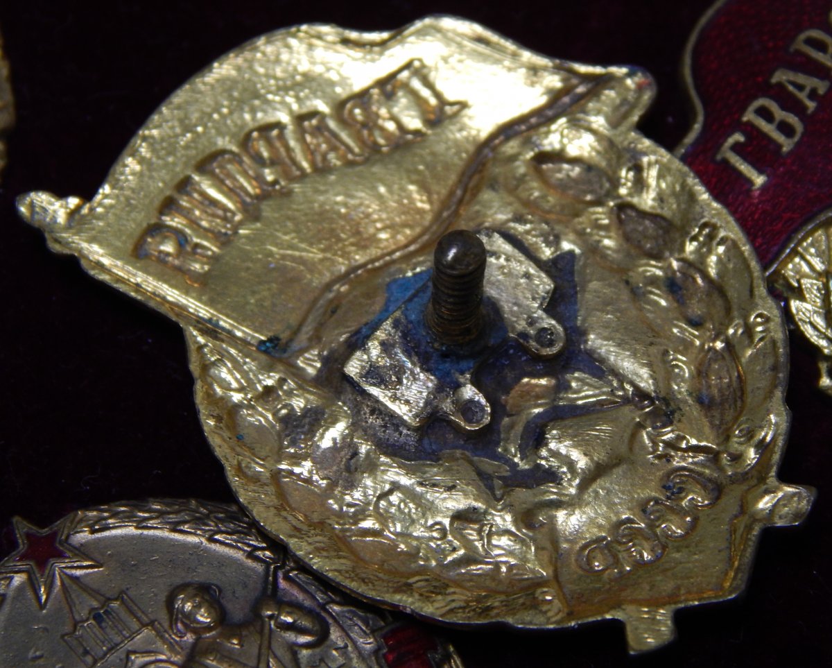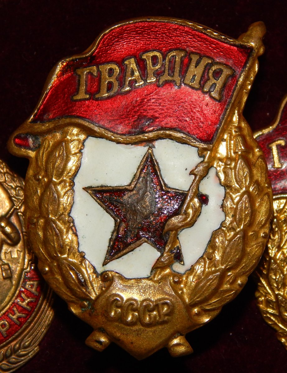 Гвардия интересная - из ранних, с припаянной вместо винта колодочкой от знака "За отличную стрельбу РККА". Жаль, состояние подкачало...