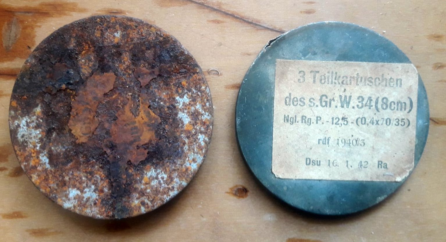 Приветствую. Прошу оценить такую банку для допзарядов к немецкому миномету 8см. и допкрышка к нему.