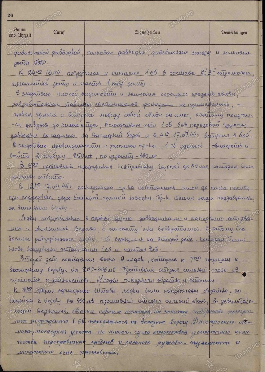 Утром 18 марта, когда последние боевые группы дивизии выступили маршем, в село Кривое Озеро прибыли большие автоколонны дивизии. Однако там они смогли получить лишь немного горючего. Поэтому их направили на железнодорожную станцию Любашевка, и вместе с другими подразделениями они были перевезены по железной дороге в Балту. Все остальные, кто мог передвигаться на собственных транспортных средствах, главным образом последние группы боевых частей, присоединились к 3-му батальону 36-го танкового полка. Они прибыли в Балту своим ходом 22 и 23 марта. Тем временем те части дивизии, которые отстали больше всего, смогли переправить по мосту через Южный Буг большую часть своих исправных автомобилей. Таким образом, когда 21 марта русские ворвались в Первомайск, в их руки попало только несколько неисправных развалюх. После того как последние конвои покинули город и отправились на запад, на южном берегу реки, в городском районе Голта, было собрано большое число орудий и тяжелых грузовиков, требующих ремонта. Поскольку нигде уже нельзя было найти тягачи или тракторы для их транспортировки, было решено, несмотря на усиливавшийся с каждым часом артиллерийский обстрел и налеты вражеской авиации, погрузить их на железнодорожные платформы. Большую часть этой военной техники удалось ночью вывезти на запад. Нельзя не восхититься тем хладнокровием и той энергией, с которой, несмотря на нервное напряжение и охватившую многих панику, были выполнены эти трудные задачи. В этой связи хотелось бы отметить следующий эпизод, который особенно ярко характеризует несгибаемый боевой дух бойцов дивизии. 22 марта во время отправки одного из последних железнодорожных составов с несколькими 88-мм зенитными орудиями с северного берега Южного Буга по нему был открыт сильный огонь из танков и противотанковых пушек. Обер-фенрих Штефан, который руководил отправкой зениток, тотчас открыл ответный огонь и подбил — с движущегося поезда, ведя огонь перпендикулярно движению! — один за другим сначала один русский танк, а потом и противотанковую пушку. Из тех обозов, которые своим ходом прибыли в Балту, лишь немногие смогли добраться до переправы в Рыбнице, так как уже 23 марта русские перерезали железнодорожную линию и шоссе между железнодорожной станцией Борщи и Слободкой, а двумя днями позже они взяли и село Воронково. Большая часть обозов задержалась из-за грязи на дорогах и временной нехватки горючего, но прежде всего из-за необходимости отремонтировать вышедшие из строя грузовики, и их пришлось направить по маршруту Бирзула (Котовск) — Любомирка — Ставрово к мосту в Дубоссарах. Поскольку вскоре на этой дороге скопились все те, кто двигался из Первомайска на запад, некоторые небольшие группы обозов предпочли поехать в обход через Павловку. Но и здесь они наткнулись на бесконечные колонны беженцев — немцев и румын из-под Одессы, которые двигались очень медленно, так как вели с собой домашний скот. И если даже на последнем участке пути состояние дороги несколько улучшилось, скорость движения увеличилась совсем незначительно, так как участились остановки и заторы, вызванные как раз теми органами, которым было поручено регулировать движение. Отдельные посты полевой жандармерии явно не справлялись со своими обязанностями. В своем вполне оправданном стремлении осво
