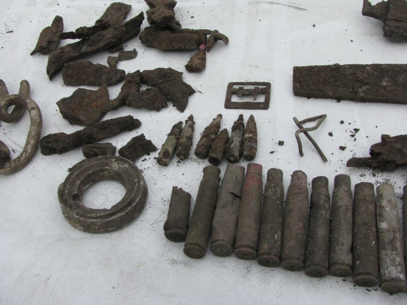 Уффф - сегодня у нас случился первый коп по войне. Рыли с 10 утра до 13-30. Результат на фото. Получил мове впечатлений и эмоций - когда рыли окоп (который уже до нас кто-то основательно выбил) были поражены количеством осколков - они были везде - в посадке, в поле, короче везде. Попалась даже шрапнель (я могу ошибаться - свинцовый шарик). Гильз и пуль нашли много + пару целых патронов + жетон + тюбик от чего-то (краска облупилась) + интересной была находка сгнившей гитары - точнее от гитары нашли только колки. По поводу жетона - кто что может сказать что это конкретно, т.к. за надней стенке вроде инициалы и даты (всё нацарапано)... + на шестом фото есть вопрос по большой тяжёлой круглой железяке - что это???