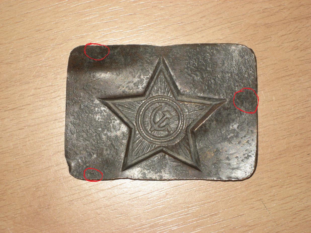 Re: Одесса... У советской пряжки крепёж был в трёх точках: 1. Зацеп и 2 точки сдвоенная дуга. Пайка иногда была очень слабая, а потому отламывалась и фактически не оставалось следа. Звезда зашлифована специально (так за два года бархоткой не затрёшь). Предположу, что нарочно было оторвано нутро и удалены следы, и шлифовали под "блямбу" на дембельский альбом или т.п. Но, данный девайс точно послевоенный. У нас в полку таких кустарей множество было.... А вот что она на той глубине делала - это вопрос!