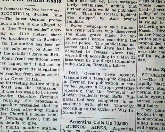 Re: Одесса... На аукционе продают экземпляр газеты Нью Йорк Таймс за 1943 год,пригляделся,ба,да это же по теме поднятой не давно Рональдом... "Румын считают виновными за убийство 5 000. Берн,Швейцария,20 июня.Швейцарские газеты пишут сегодня,что 5 000 тел,о которых докладывали пропагандисты стран Оси,похороненные вблизи Одессы,были румынские евреи убитые румынской секретной полицией.Румынская пресса объявила об открытии массового захоронения 22 апреля,заявляя,что тела принадлежали румынам убитыми русскими после присоединения Бессарабии и Буковины в 1940 г.Позже,DNB,немецкое официальное агентство новостей сообщило"опознание трупов в новом массовом захоронении еще не удовлетворительно проведено",добавив,что о дальнейших деталях будет сообщено позже.Потом одесский инциндент был заброшен пропагандистами стран Оси.Швейцарские газеты утверждают,что румынские армейские офицеры ,открывшие массовое захоронение ,сделали заявление не проконсультировавшись с секретной полицией.Публикации подчеркивают ,что 5 000 евреев были депортированы в Одессу,где они были убиты ,согласно трансляции12 мая не легальной румынской радиостанции Romania Libera."