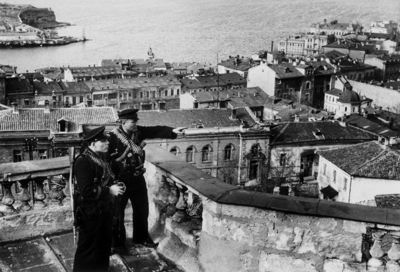 И так что мы имеем, фотограф-Владислав Микош. Включаем Гугл поиск, и получаем еще 3 фотографии этого фотографа, с изображением матросов в осажденном Севастополе в 41 году.На них и дома в городе целые и люди радостные и матросы наглаженные.И коменты адекватные. Командиры разведчиков морской пехоты на рекогносцировке в Севастополе Категория: Жизнь советских войск, Оборона Севастополя Информация о фото Время съемки: 1941-1942