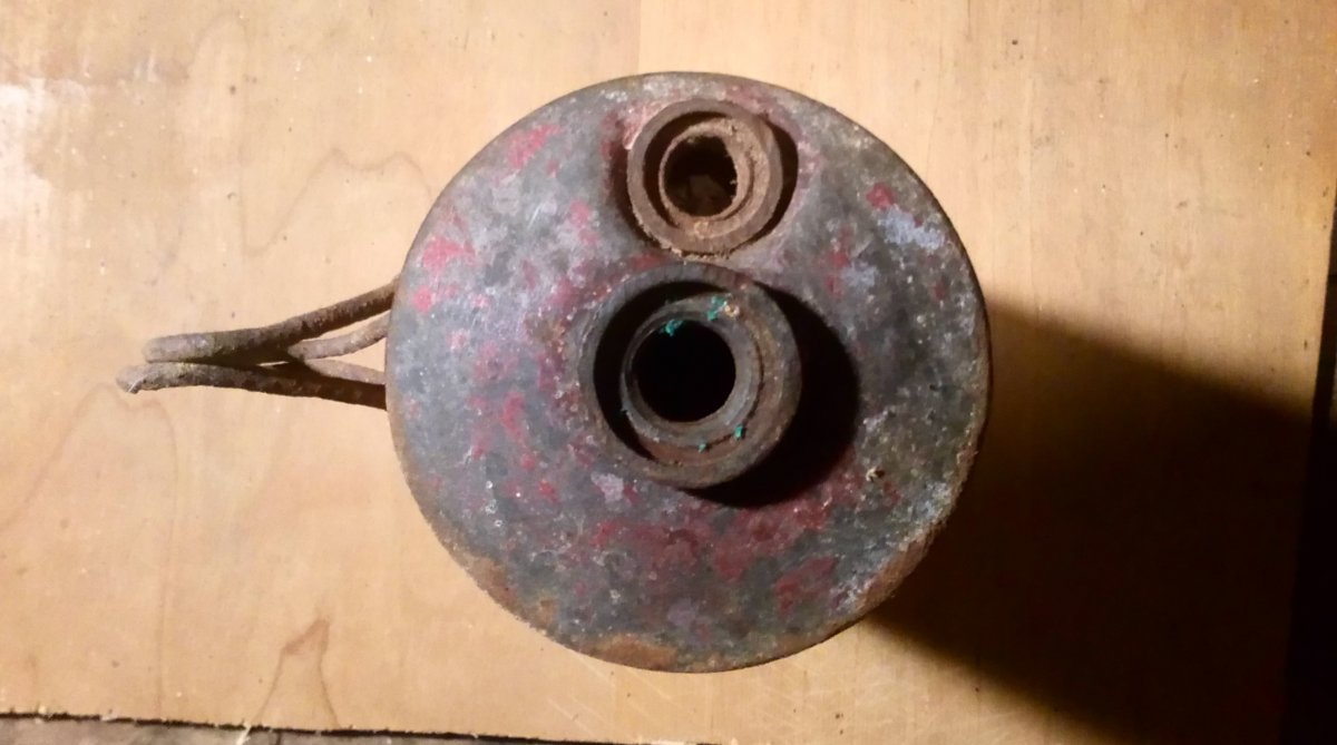 Приветствую! Нашёл такой бачек. Чем-то похож на немецкий огнетушитель, но немного другой. Клейм не нашёл, был покрашен красной краской.