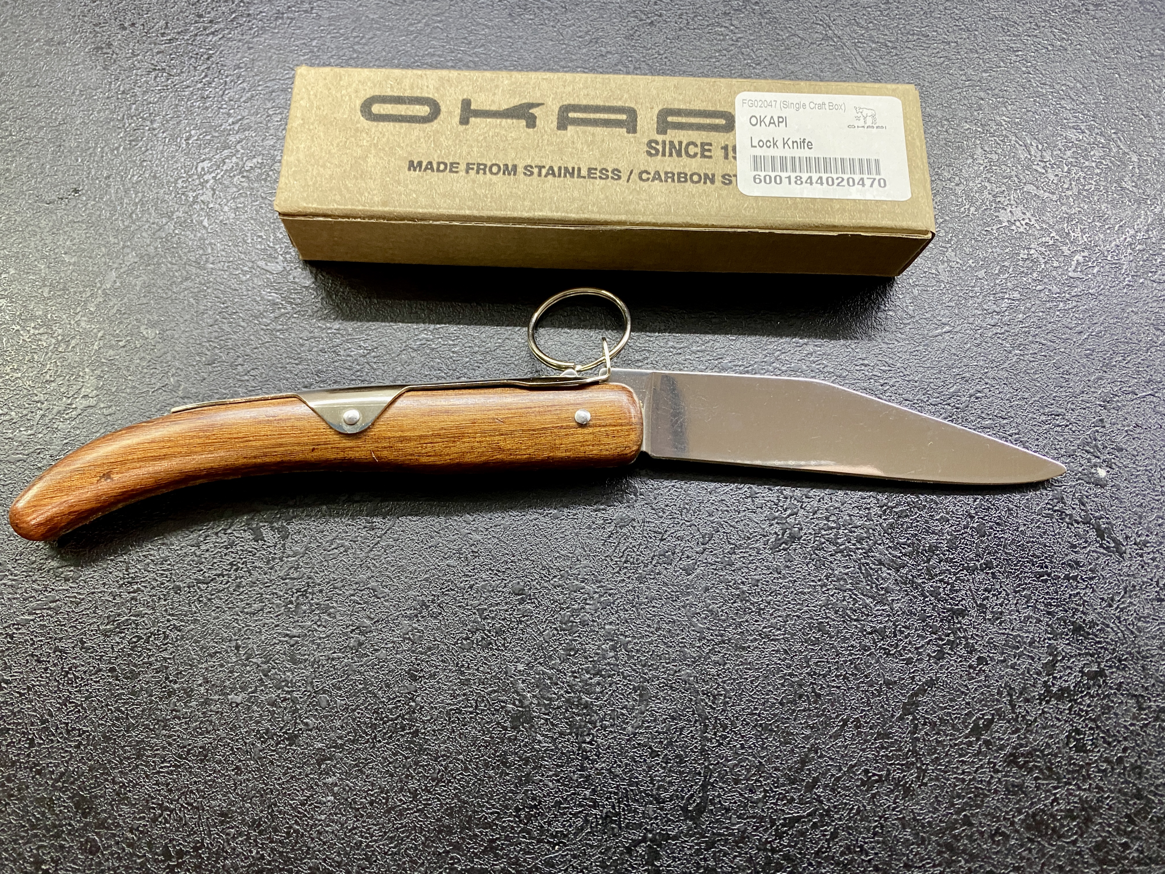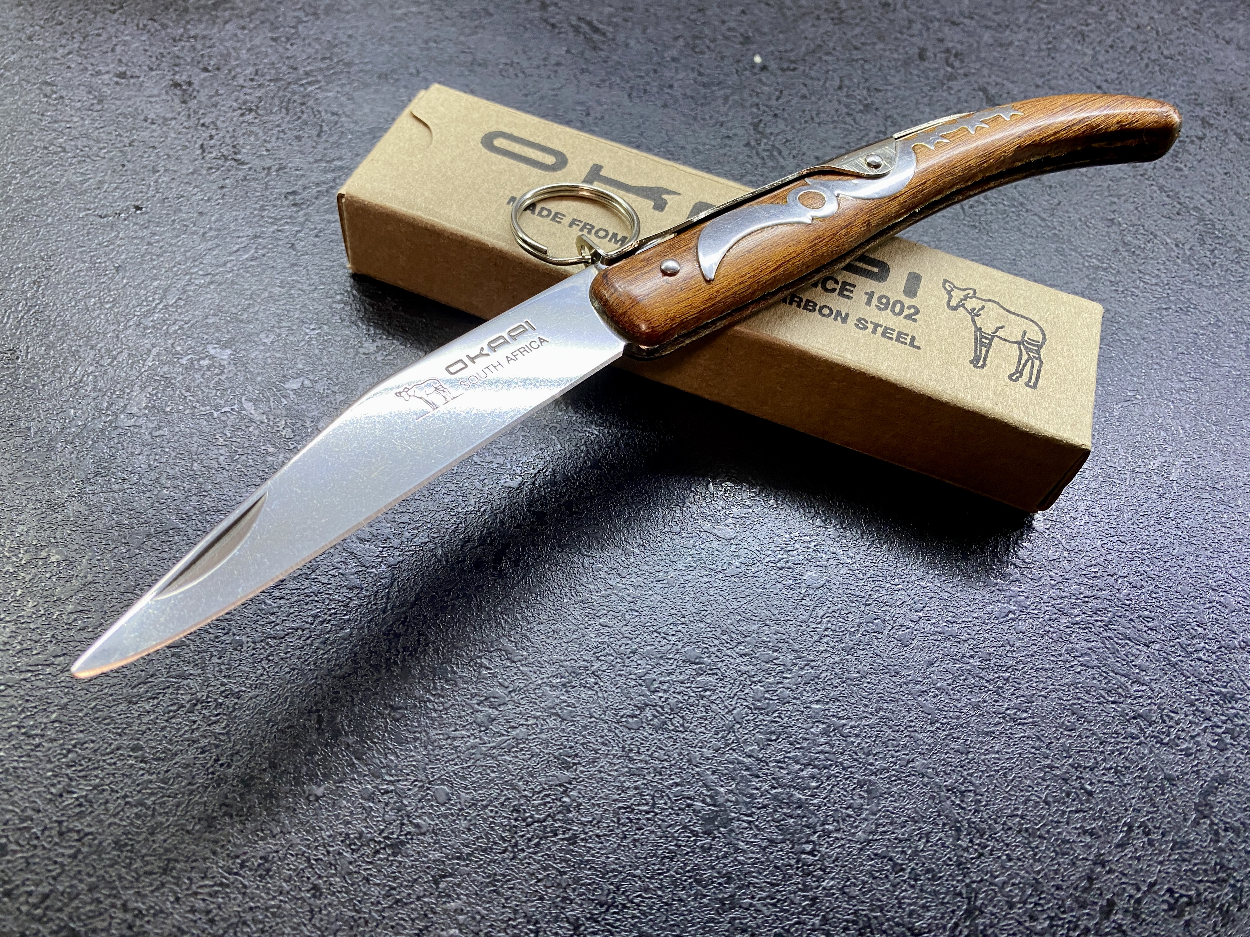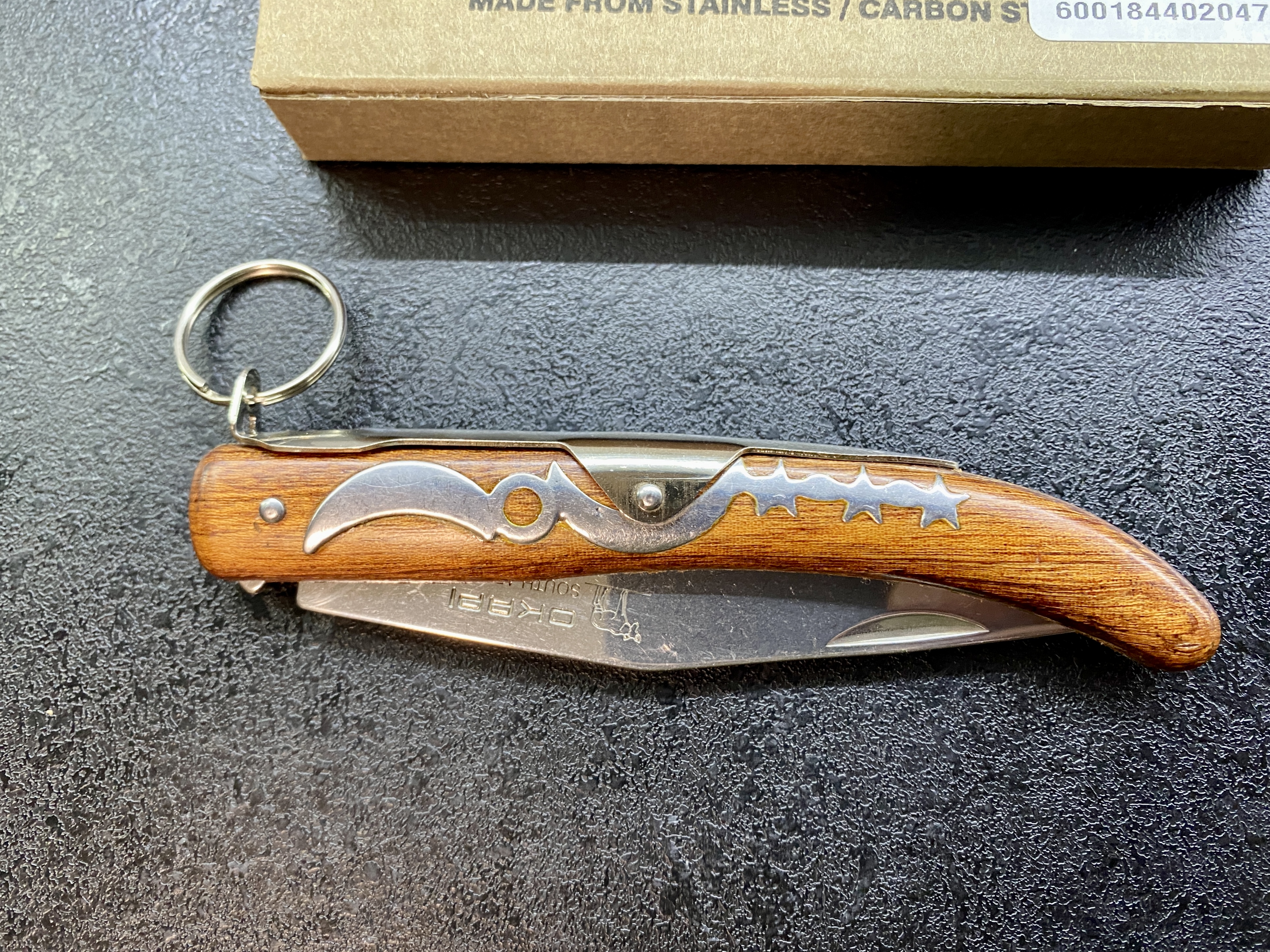 Okapi Keyring Новий, в коробці. Окапі — це ніж із застібкою із храповим замком або ковзаючий ніж, спочатку виготовлений у 1902 році для експорту до німецьких колоній в Африці . Свою назву ніж отримав від центральноафриканського окапі , схожого на жирафа. Компанію Okapi South Africa кілька років тому викупив німецький Lasher. Якість ножів повернулася до належного рівня. Після переходу до Lasher на клеймі леза зник напис "Made in". Ножі Окапі дуже популярні в Південній Африці, але мають досить погану репутацію, оскільки їх асоціюють із злочинцями та вуличними бандами. Через використання Okapis злочинцями їх прозвали «особливими ножами суботнього вечора». На Ямайці вони одночасно є інструментом і одними з найбільш улюблених «храпових ножів», які носять грубі хлопці, і також відомі як «три зіркові тріскачки». Відомо, що Кіт Річардс з Rolling Stones роками носив великий Окапі, який йому подарували на Ямайці. Закальна довжина ножа: 140 мм; Довжина леза: 114 мм; Матеріал леза: вуглецева сталь 1055; Замок: храповий механізм. Вага: 73 грам. Ціна: 1100 грн. Знаходжусь у м. Києві. Тел.: (067) 238-56-38. Григорій. Прошу дзвонити, краще писати у Telegram/Viber. Доставка Новою поштою за ваш рахунок.