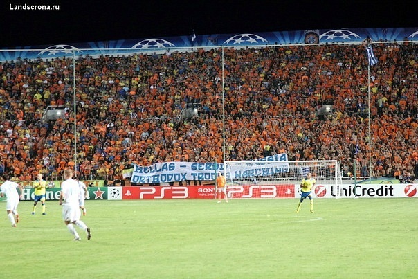Re: Обращение болельщиков ЦСКА В первом тайме на фанатской трибуне Апоэла (хотя по ходу матча трудно было отличить остальные трибуны от неё в плане отдачи по шизе) появился баннер "Греция - Сербия - Россия - православные идут!". Так же рядом с баннером можно разглядеть имперский флаг