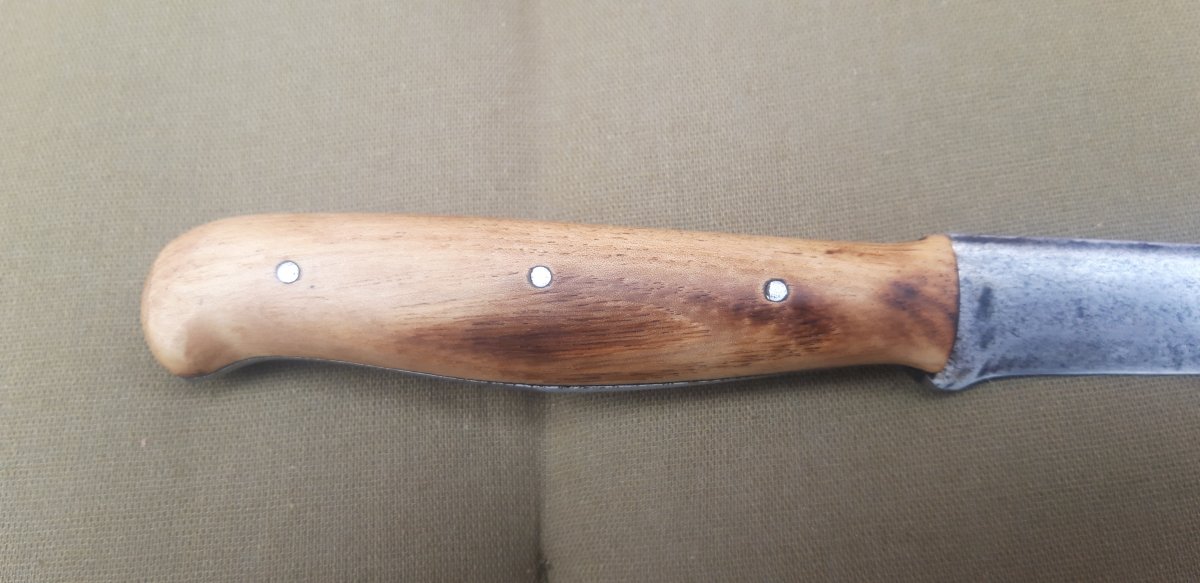 Имитация . Лет десять тому такие ножи в нулевом состоянии ( с гардой ) стоили от шести евро на сотню штук или по такой же цене продавались подписчикам какого то немецкого военноисторического журнала . Сегодня все не так , возможно евро двадцать попросят
