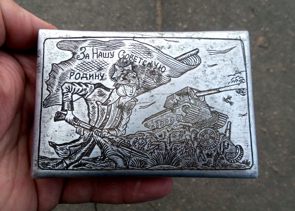 ...и вот ещё один прилетел на бреющем...... Портсигар-табакерка из алюминия со вставками из текстолита или бакелита с торцов.Швов и стыков я так и не нашёл. Почему-то удалено имя подарившего.Предположу что это было имя девушки.И наверное не только имя,но и что-то типа "С ЛЮБОВЬЮ". Хорошо видно,что затёрты две строки. Видимо после войны,что-бы не раздражать свою реальную девушку или жену,ветеран попросту затёр имя той,которая подарила ему на память этот портсигар.Жизнь и её сложные,иногда слишком банальные,а порой жестокие оттенки,зачастую просматриваются в подобных предметах. По ним даже можно иногда как по книге прочитать судьбу и биографию человека.