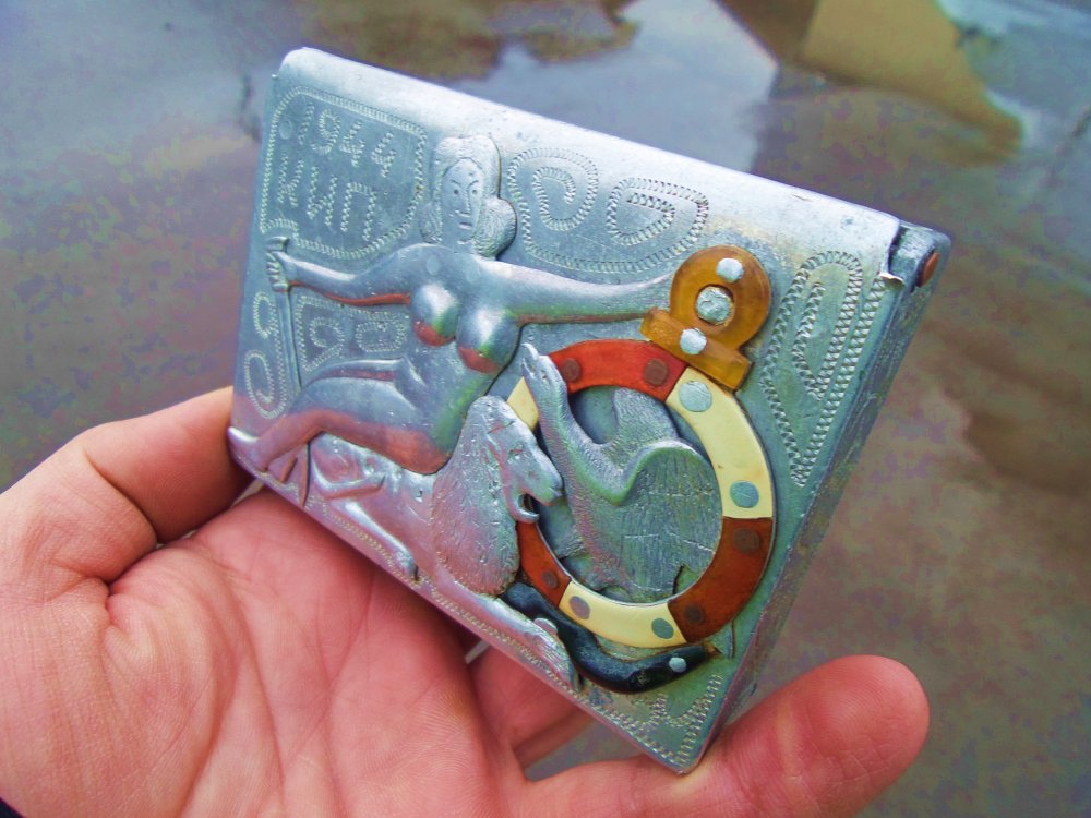 Зеркало из северных земель. Изготовлено в ярко-выраженном финском стиле с вмонтированным зеркалом со сбитого П-40 из набора выживания пилота. Изготовлено из двух склёпаных цинковых пластин,а зазор между ними был замазан каким-то составом.