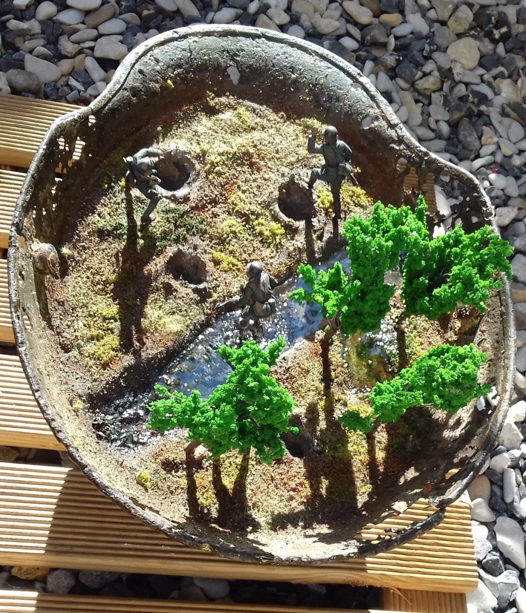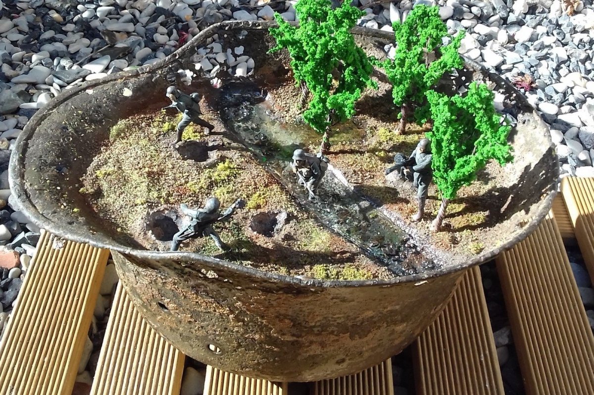 Еще одна хорошая идея со старым шлемом, но на мое мнение бедновато. Можно было окопы и поинтересней сделать, а воронки от снарядов вообще на себя не похожи.