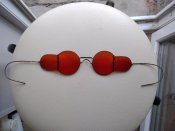 Это защитные, рабочие очки 30х годов. Бывают с прозрачными стеклами и темными, разного оттенка, ( зеленоватый, синеватый). Встречаются на фото 30-40х гг в качестве солнцезащитных. Часто притягиваются за уши, как очки РККА.
