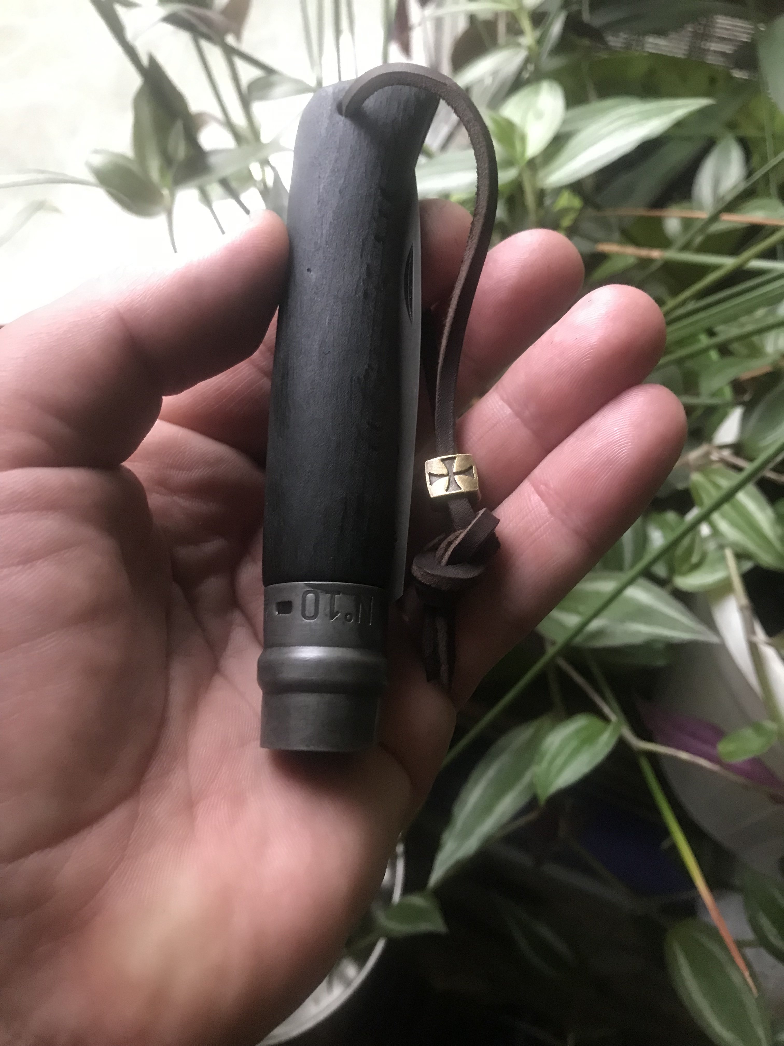 Изменена геометрия рукояти, обоженна и проварена в льняном масле. Добавлены шайбы на ось. Изменена геометрия клинка на дроппоинт, замок и лезвие протравлены. Заточка заводская. Темляк. С темляком 850, без 800 грн