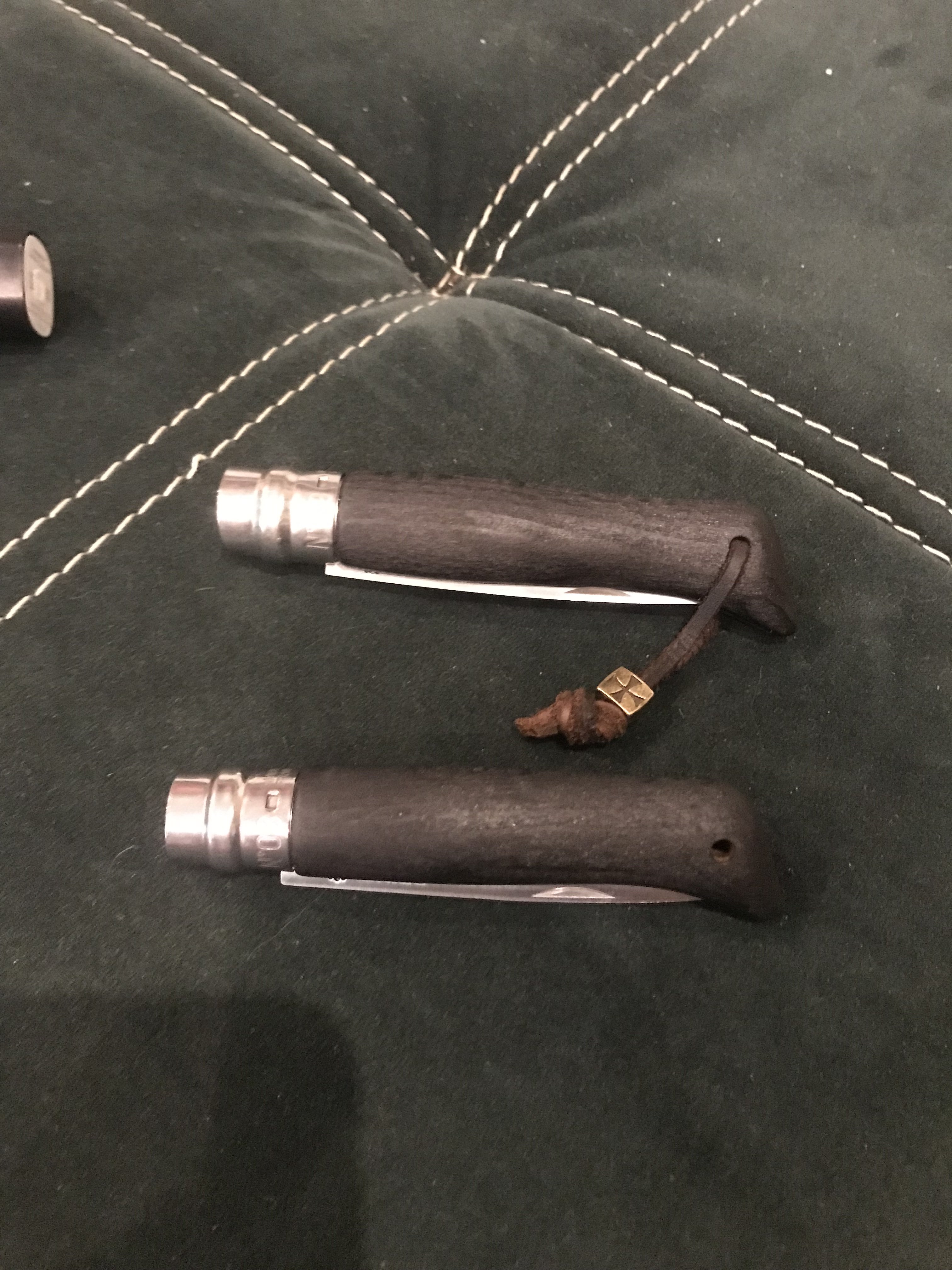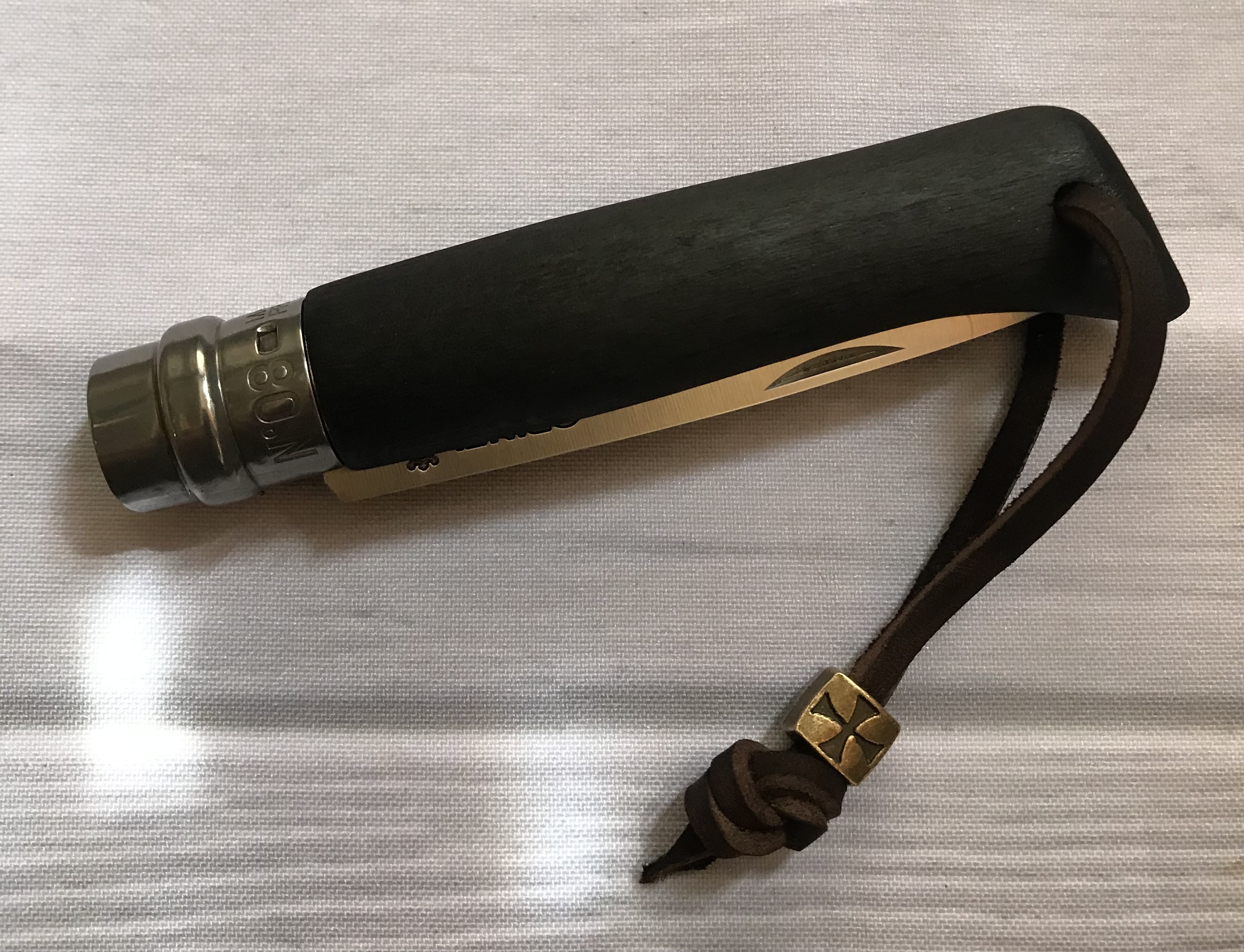 Новый. По изменениям: изменена геометрия рукояти, обоженна и проварена в льняном масле. Изменена геометрия клинка на дроппоинт, добавлены шайбы на ось. Заточка заводская. По желанию комплектуется темляком с бусиной. Без темляка 600, с ним 650