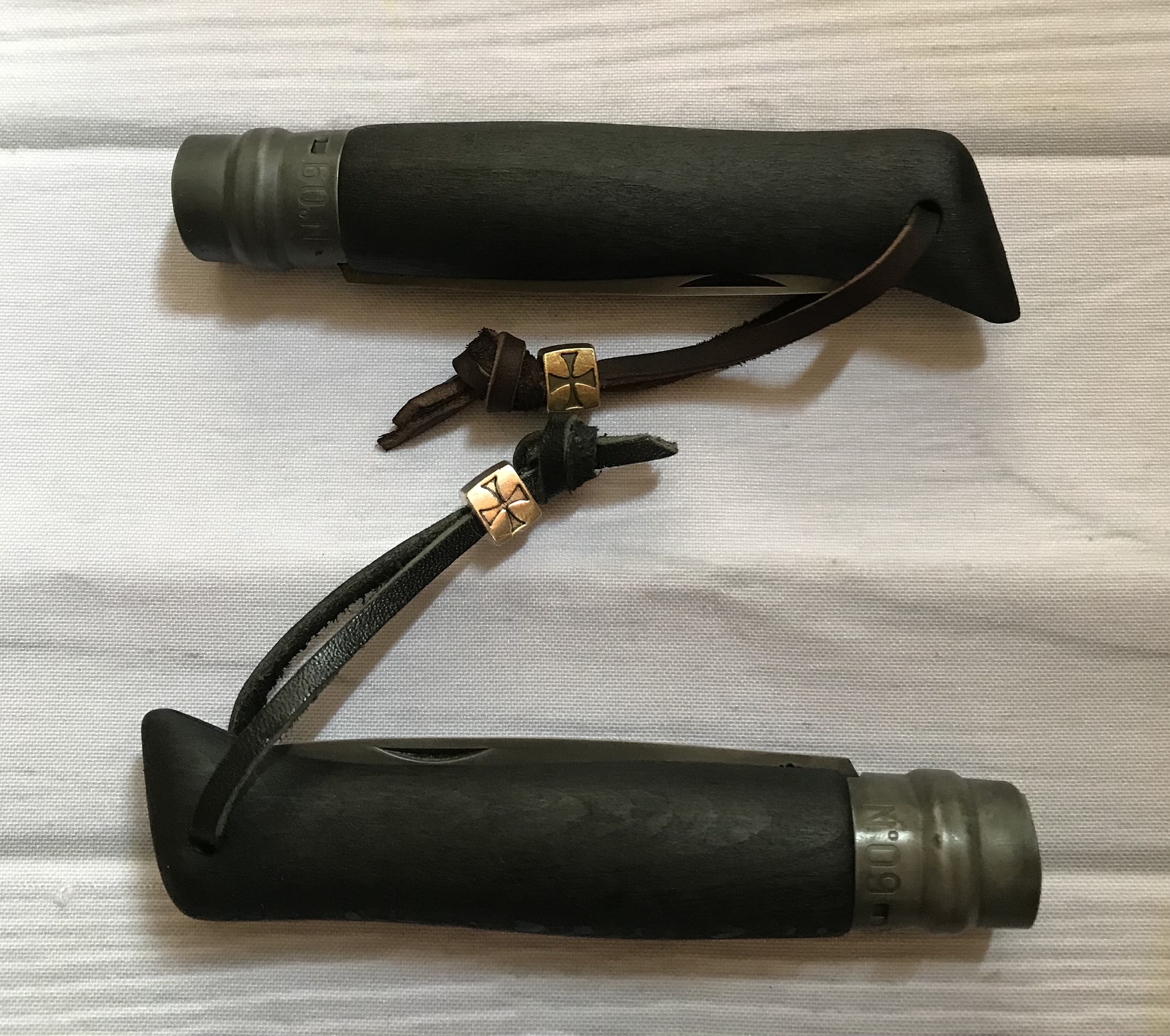 Изменена геометрия рукояти, обоженна и проварена в льняном масле. Добавлены шайбы на ось. Изменена геометрия клинка на дроппоинт, замок и лезвие протравлены. Заточка заводская. Темляк. С темляком 750, без 700. Чехла нет