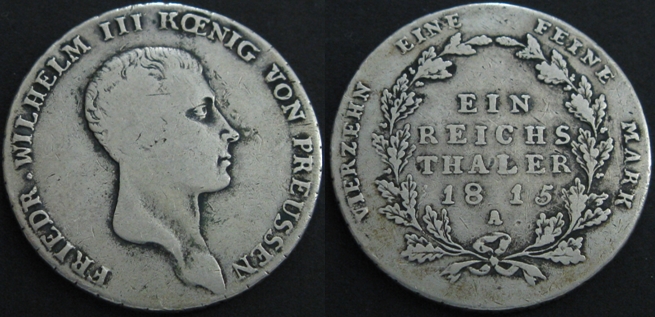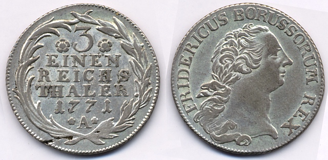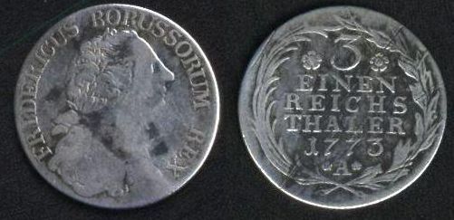 Ответ: опять монеты Спешу обрадовать.Так сказать не лень было-нашел одну! 1 талер. ГЕРМАНИЯ. Пруссия. 1815 A. Вильгельм III. серебро 22,272 гр. 35 мм В том сохране что на фото стОит 2400 рубликов.А на счет представленных выше монет считайте цену сами,в зависимости от убитости монеты. А вот у нас и вторая Пруссия, 1/3 талера 1771г.Берлин,Серебро(Ну тут 1773 особой роли не играет) Цена 2500р