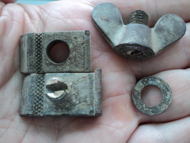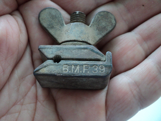 Нуждаюсь в помощи для определения выкопанных четырех предметов: Закрутка с надписью на непонятном языке. Металл цветной. Чья и от какого механизма? Алюминиевая накладка с надписями и стрелками. От какого прибора может быть? Цоколь от немецкой лампы с надписями и птичкой. Использовался вермахтом? Рация? Какой-то зажим. Материал бронза. Неудачно пробовал раскрутить сломал болт. Надписи B.M.F. 39. Для чего применялся? 39- это год?