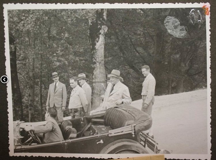1938 walk near Hitler's Berghof home in Bavaria. Albert Speer behind the wheel (not in his BMW, and this isn’t a Mercedes). Outside the car are Hermann Esser, Rudolf Hess, Adolf Hitler, Martin Bormann and Brueckner.