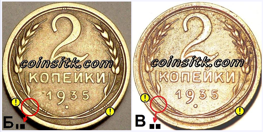 Вторая 2 копейки 1935 года - лицевая сторона старый тип, шт. 1.3 – легенда ближе к канту, серп в полюсе. Оборотная сторона шт. Б – вариант узелков(http://moneta-russia.ru/soyuz/sssr/2-kopeyki-1935-goda-tsena.php). Но опять же вопрос с узелками... Заранее признателен