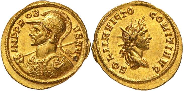 Ауреус імператора Проба (276-282 рр н. е.) IMP PROBVS AVG, radiate, cuirassed bust left, holding spear and shield / SOLI INVICTO COMITI AVG, radiate, draped bust of Sol right. RIC 138; Cohen 696.