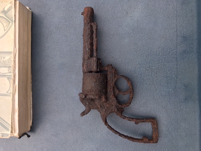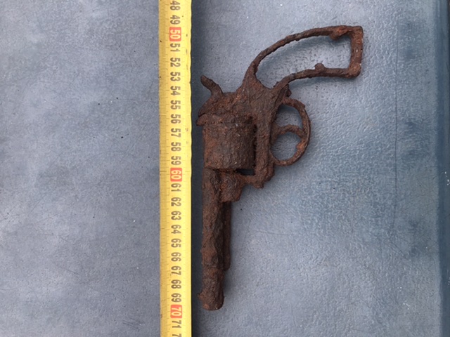 конструкции. Бельгиец. Калибр 380 1878 года. Крайне примитивен. Барабан илеет две точки фиксации-собачкой и спуском. Механизм спуска самовзводный. Вручную на взвод не ставился несмотря на наличие спицы на курке. Мной такой же был найден в далеком 75. Называется ето чудище Опекун или Американская модель. На просторах инета встречал такое с кобурой и в идеальном состоянии. Кстати у Жука есть за номером 27-3 страница 214. Не первый на форуме. Было до него парочка таких же
