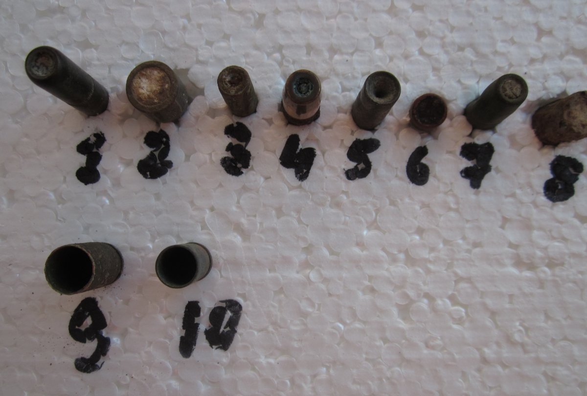 1. трассер патрона Спрингфилд .30-06 2. кольт 11,43 (.45 АКП) 3. Арисака 4. маузер (S.m.K.L'Spur ?) 5. 7,62 Х 54, пуля "Л" 6. 7,65-мм Браунинг - его гильза №10 7. Спрингфилд .30-06 ? 8. заскорУзлый 9-мм Люгер - его гильза №9 9. гильза 9-мм Люгера 10. гильза 7,65-мм Браунинга ...ну, как-то так...