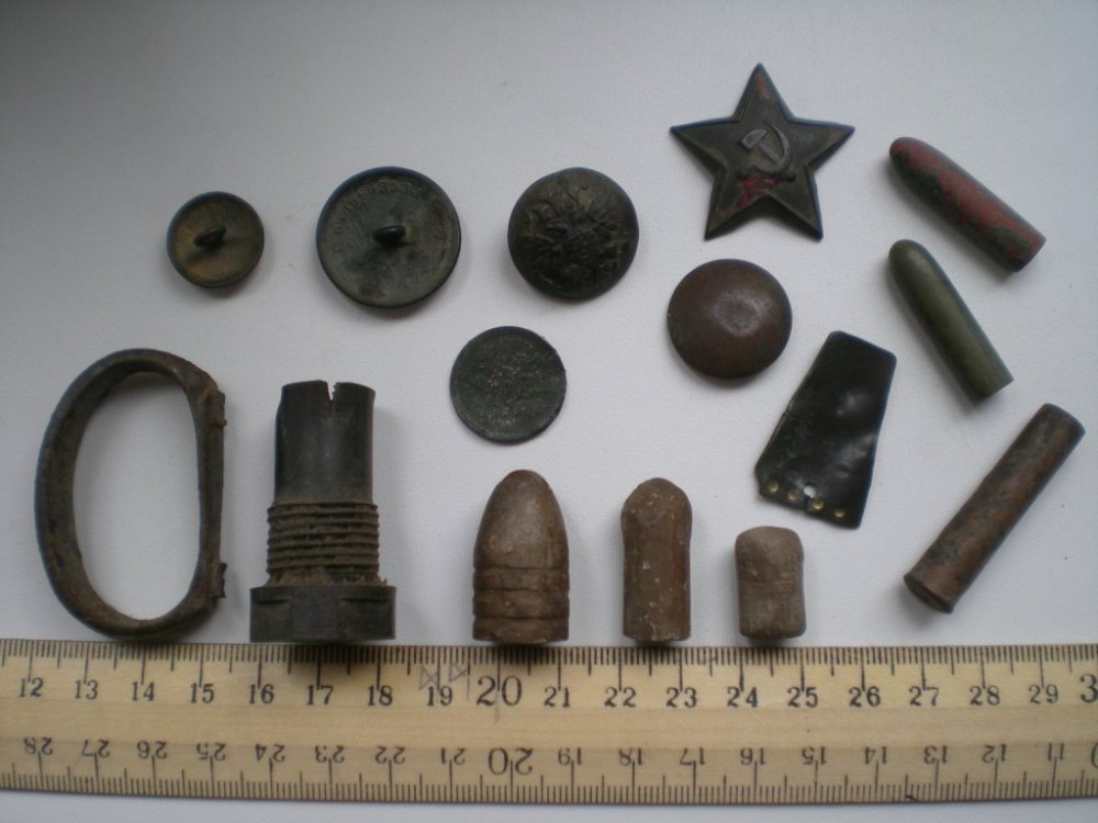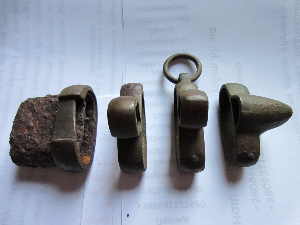 Нижний ряд,первая слева-часть от ножен шашки,ИМХО,хорошо бы фото с других ракурсов.Последняя в ряду гильза от нагана.С ув.