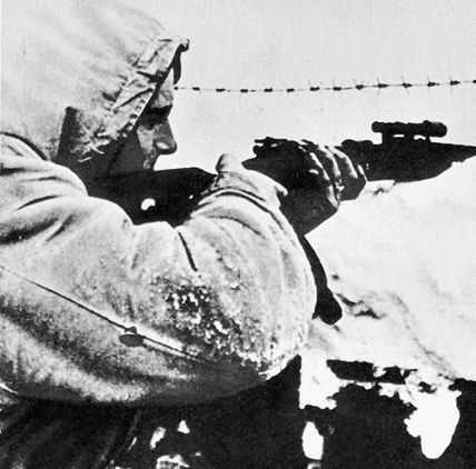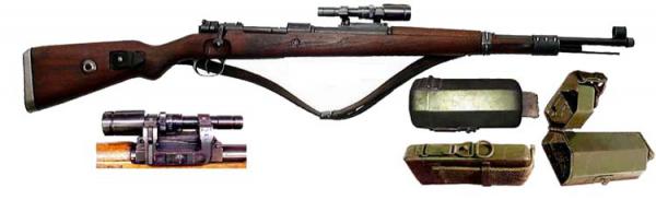 Немецкий оптический прицел ZF41. https://yandex.ru/images/search?from=tabbar&text=Немецкий оптический прицел ZF41 "... оптический прицел ZF41 с увеличением 1,5х крепился к специально выточенной на прицельной колодке направляющей, так что расстояние от глаза стрелка до окуляра составляло около 22 см. Немецкие специалисты по оптике считали, что такой оптический прицел с небольшим увеличением, установленный на значительном расстоянии от глаза стрелка до окуляра, должен быть достаточно эффективным, поскольку позволяет наводить перекрестие на цель, не прекращая наблюдения за местностью. При этом малая кратность прицела не дает значительного расхождения в масштабе между предметами, наблюдаемыми через прицел и поверх него....Кроме того, такой вариант размещения оптики позволяет заряжать винтовку с помощью обойм, не теряя при этом из поля зрения цель и дульный срез ствола. Но естественно, что снайперская винтовка с таким маломощным прицелом не могла быть использована для стрельбы на большие дистанции. Впрочем, такое приспособление все равно не было популярно среди снайперов вермахта – зачастую подобные винтовки попросту бросали на поле боя в надежде найти себе что-нибудь получше..."