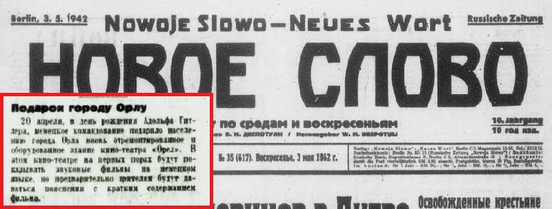«20 апреля , в день рождения Адольфа Гитлера, немецкое командование подарило населению города Орла вновь отремонтированное и оборудованное здание кино-театра «Орел». В этом кино-театре на первых порах будут показывать звуковые фильмы на немецком языке, но предварительно зрителям будут даваться пояснения с кратким содержанием фильма.» Газета «Новое слово», Берлин, 3 мая 1942 г.