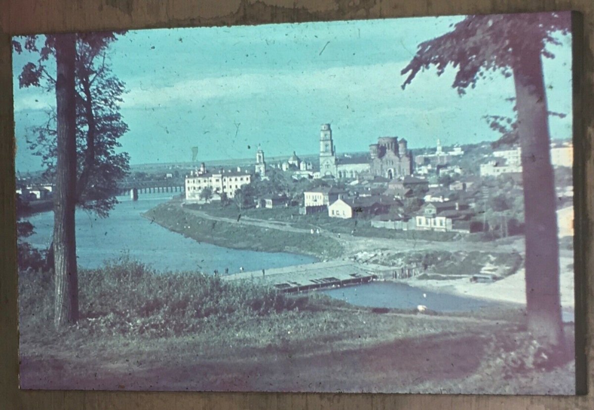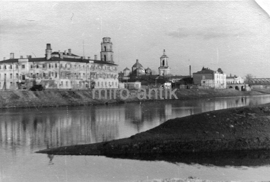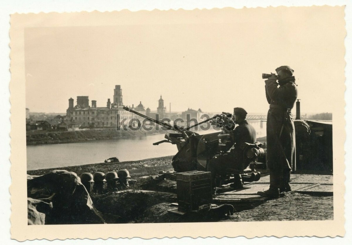 Немецкие зенитчики на берегу Оки. Вдалеке виден Красный Мост, соединяющий Гостиную улицу с Московской. Мост был уничтожен немцами в 1943 году при отступлении.