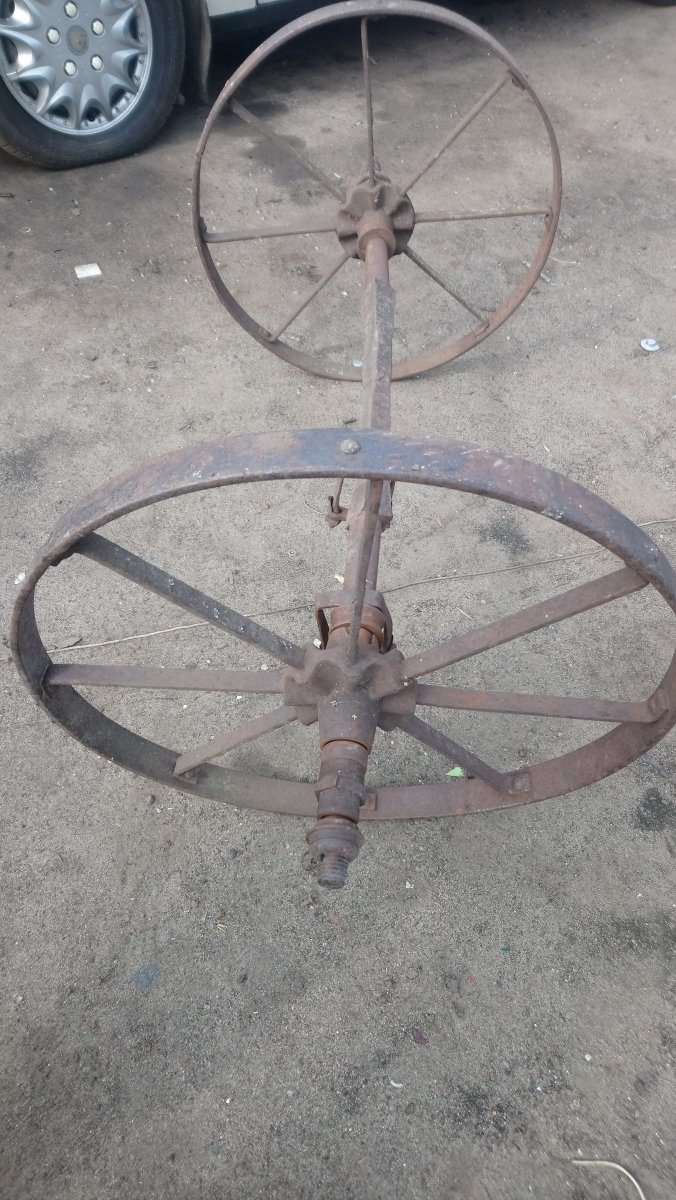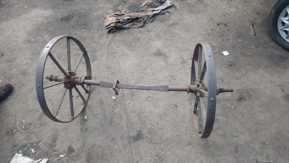 Буквально неделю назад обсуждали похожую! Вполне полезный предмет - на металл сдавать не надо! Соседи мои пристроили ящик деревянный к такой оси и летом во дворе выставляют горшки с цветами.... Я к похожим колёсам пристроил рамку с ручкой и вот уже 30! лет таскаю то брёвна,то камни,то бочки...