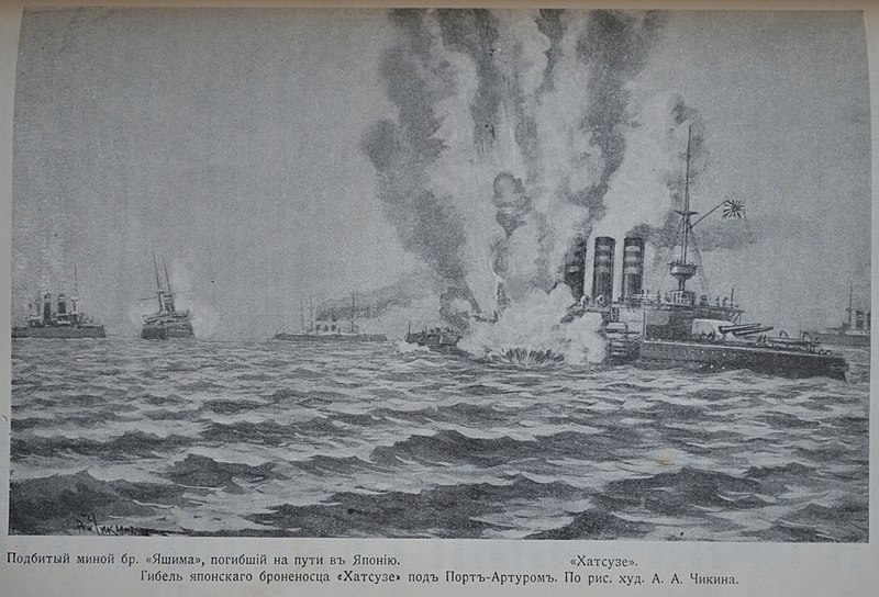 "Хацусе" и "Ясима" После гибели Макарова 1-я эскадра стояла в гавани ,японцы получили полное господство на море . Каждое утро японские корабли проходили одним и тем же курсом обстреливая Артур. Витгефт дал разрешение командиру минного заградителя "Амур" капитану 2 го ранга Иванову поставить мины на пути следования японцев. Иванов нарушил приказ поставив "букеты" из мин не в 8, а в 11 милях от Артура . На следующий день японцы следуя привычным курсом наткнулись на минное заграждение. То был самый большой триумф моряков 1 ТОЭ. в 9:55 "Хацусе" вздрогнул от взрыва . Японцы смогли снять с него часть команды . погибло 35 офицеров и кондукторов и 449 нижних чинов . На помощь поспешил "Ясима" и тоже подорвался ,впрочем его японцам удалось отбуксировать к острову Энкаунтер-Рок где с него сняли команду и корабль затонул. Таким образом шаблонные действия привели к гибели двух линейных кораблей . "Ниссин" и "Кассуга" ,которые японцы ввели в действие конечно же не смогли заменить броненосцы британской постройки.