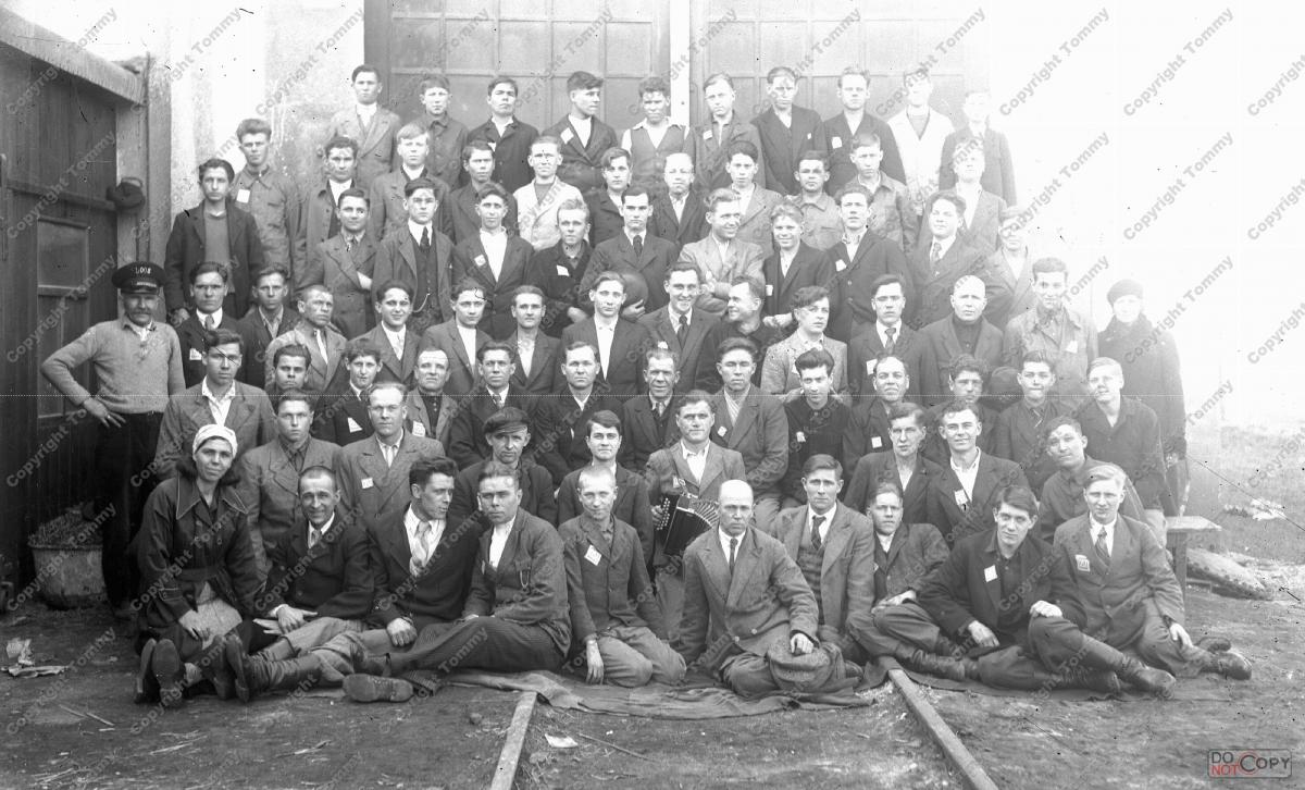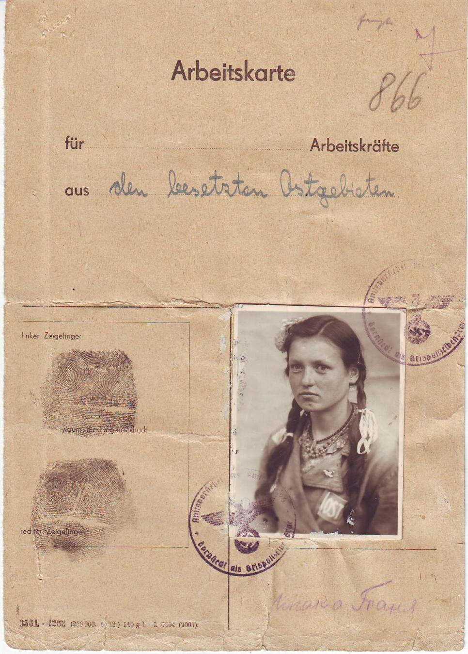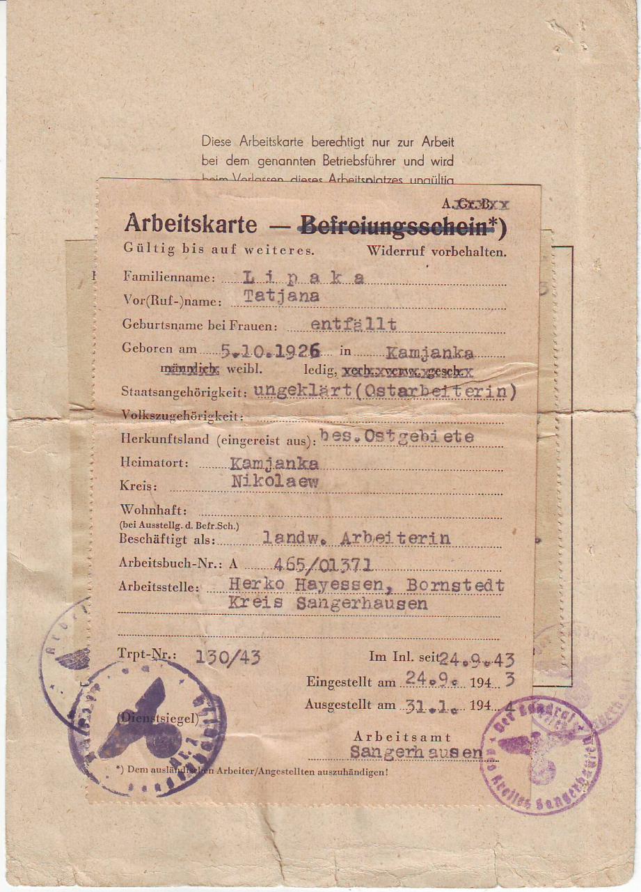 Фото 1944 р. зроблене в м. St. Inberg. Всі дівчата з с. Летава (Чемеровецького р-ну), хлопці з с. Кугаївці (Чемеровецького р-ну) Хмельницької обл. Були забрані до Німеччини у 1942 р. Із всіх присутніх на фото ще живе Грицюк Калина 1924 р.н. (стоїть третя праворуч). Від неї дізнався, що листками, які можна бачити на одязі у кількох чоловік, прикривали остівські нашивки перед фотографуванням. Обставини могли скластись по-різному. Сидить другий праворуч Андрій. Під час бомбардування американською авіацією йому відірвало праву ногу.