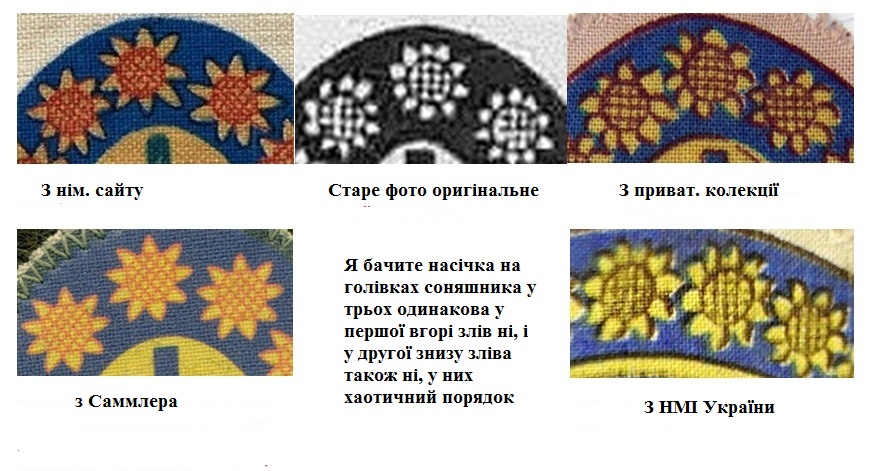 Мені вдалося поритись в неті і на одному німецькому сайті була продана за 200 евро така ж нашивка, з малюнком так як у горі, але її матерія начебто не викликала сумніву. Більше того, сайт на якому вона була куплена це свого роду магазин. Отже той магазин навіть видав експертну оцінку тій нащивці. Ось вона в центрі, а по бокам відомі нам вже нашивки, перша з яких була на рейберті представлена у 2009 році, а третя зберігається у НМІ України. Ставлю питання чому їхні дизайни відрізняються, а саме у підніжжі тризуба, завитки тієї що поцентру із загостреними кутами, а також колір тризубу темно-зелений а не синій, та інше???