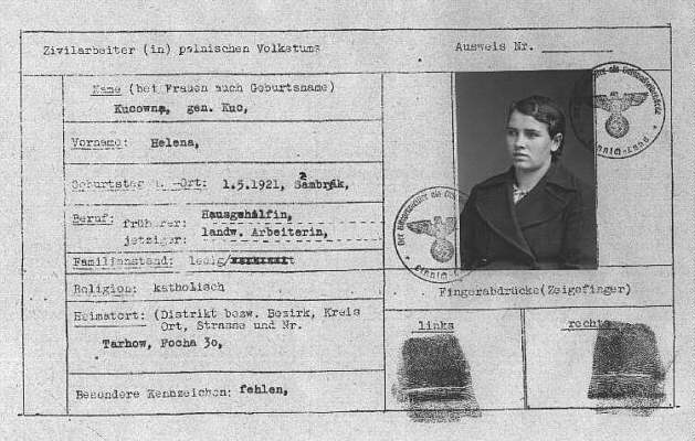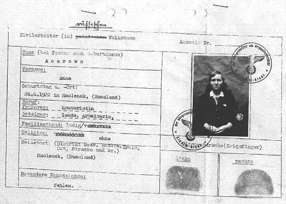 Ответ: "Остарбайтер" Документы 19-летней Анны Азаровой, которая раньше работала офисным служащим в Смоленске, теперь же выступает в роли сельхозрабочей. А также удостоверение 20-летней Хелены Куцовны, бывшей домработницы, а ныне также рабочего в сельском хозяйстве.